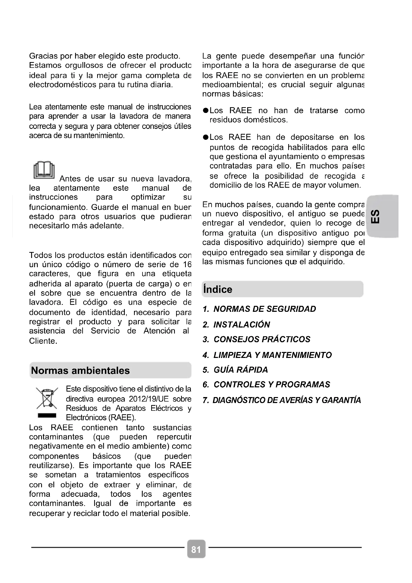 Lea atentamente este manual de instrucciones para aprender a usar la lavadora de manera correcta y segura y para obtener consejos útiles acerca de su mantenimiento.