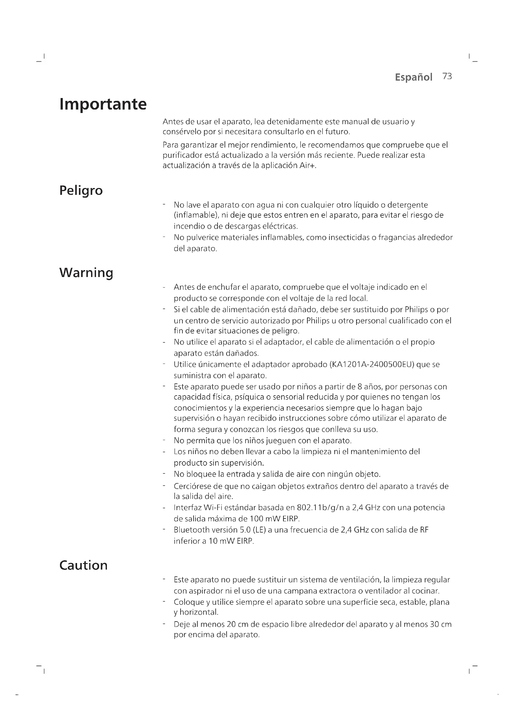 Español Importante Antes de usar el aparato, lea detenidamente este manual de usuario y consérvelo por si necesitara consultarlo en el futuro. Para garantizar el mejor rendimiento, le recomendamos que compruebe que el purificador está actualizado a la versión más reciente. Puede realizar esta actualización a través de la aplicación Air+. Peligro