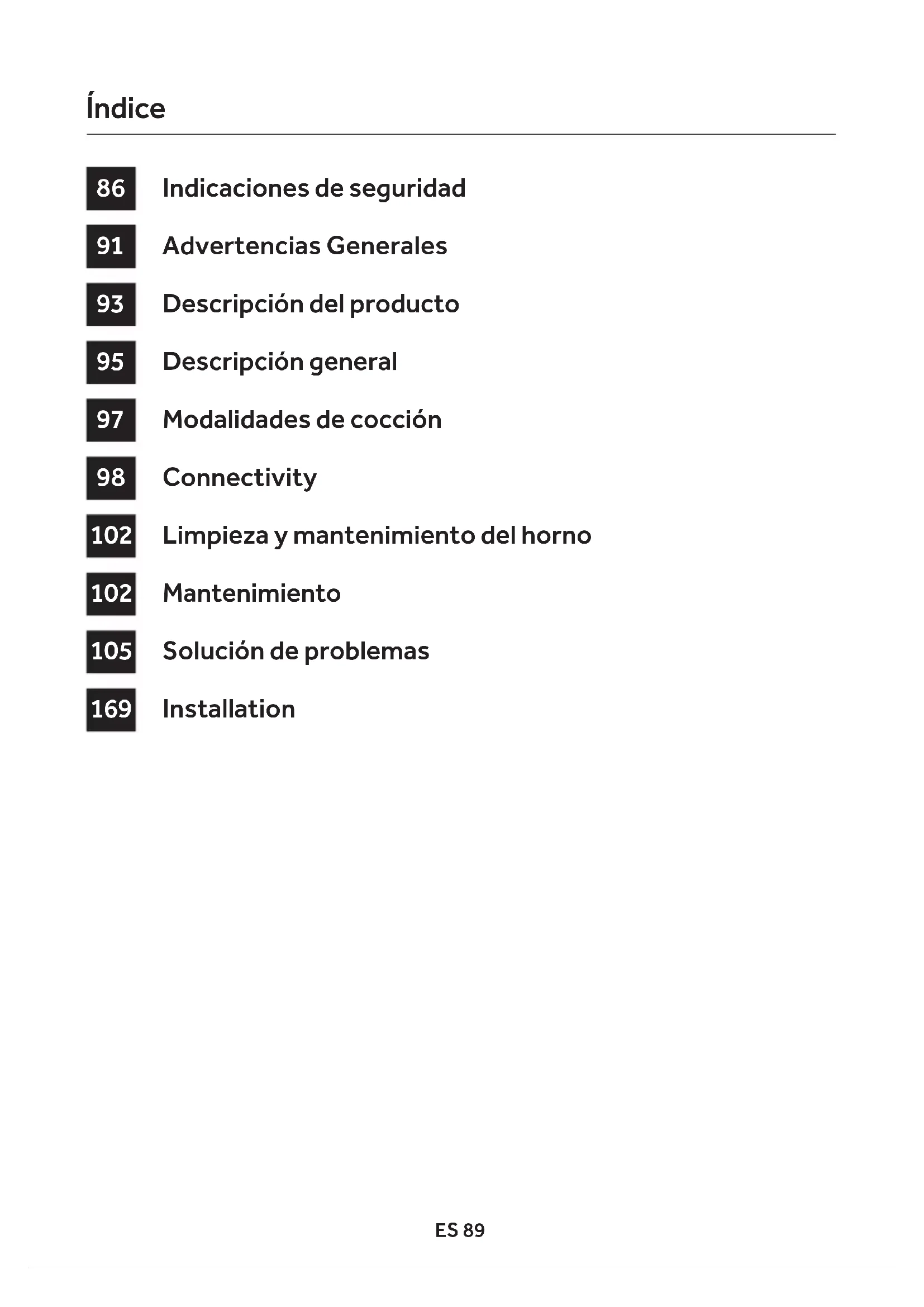 - El horno se puede ubicar en la parte alta de una columna o de- bajo de una encimera. Antes de instalarlo, debe garantizar una buena ventilación en el espacio del horno para permitir la circu- lación adecuada del aire fresco requerido para enfriar y prote- ger las partes internas. Realice las aberturas especicadas en la última página según el tipo de instalación.ES 94