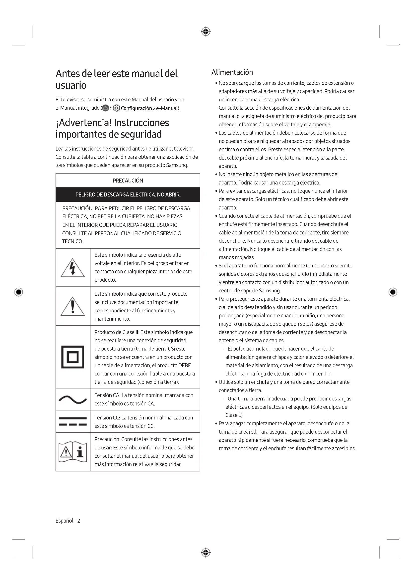 - Las figuras y las ilustraciones de este manual del usuario se proporcionan como referencia solamente y pueden no coincidir con el aspecto real del producto. El diseño y las especificaciones del producto están sujetos a cambios sin previo aviso. En caso de reparación del producto por parte de un servicio técnico no autorizado, reparación por cuenta propia o no profesional del producto, Samsung no es responsable de ningún daño al producto, ninguna lesión o cualquier otro problema relativo a la seguridad del producto causado por cualquier intento de reparar el producto, si no sigue cuidadosamente estas instrucciones de reparación y mantenimiento. Cualquier daño al producto causado por un intento de reparar el producto por cualquier persona que no sea un Servicio Técnico Certificado por Samsung no estará cubierto por la garantía. Por favor, visite samsung.com/es/support/ para encontrar más información acerca del adaptador de alimentación externo y mando a distancia bajo la normativa Ecodesing EU. Reducción del consumo de energía El televisor entra en modo de espera cuando lo apaga. Cuando está en modo de espera, sigue consumiendo una pequeña cantidad de energía. Para reducir el consumo de energía, desenchufe el cable de alimentación si no tiene intención de utilizarlo durante un periodo largo. Licencias The terms HDMI and HDMI High-Definition Multimedia Interface, and the HDMI Logo are trademarks or registered trademarks of HDMI Licensing Administrator, Inc. in the United States and other countries. Por el presente documento, Samsung declara que este equipo de radio cumple con la Directiva 2014/53/UE y los requisitos legales pertinentes del Reino Unido. El texto completo de la declaración de conformidad se encuentra disponible en la siguiente dirección de Internet: http://www.samsung.com vaya a Soporte e introduzca el nombre del modelo. Este equipo puede funcionar en todos los países de la UE y en el Reino Unido. La función 5 GHz WLAN (wifi) del equipo solo se debe utilizar en interiores. Potencia máxima del transmisor BT: 100 mW a 2,4GHz – 2,4835 GHz Potencia máxima del transmisor Wi-Fi: 100mW a 2,4GHz- 2,4835GHz, 200mW a 5,15GHz-5,25GHz, 100mW 5,25GHz- 5,35GHz & 5,47GHz - 5,725GHz