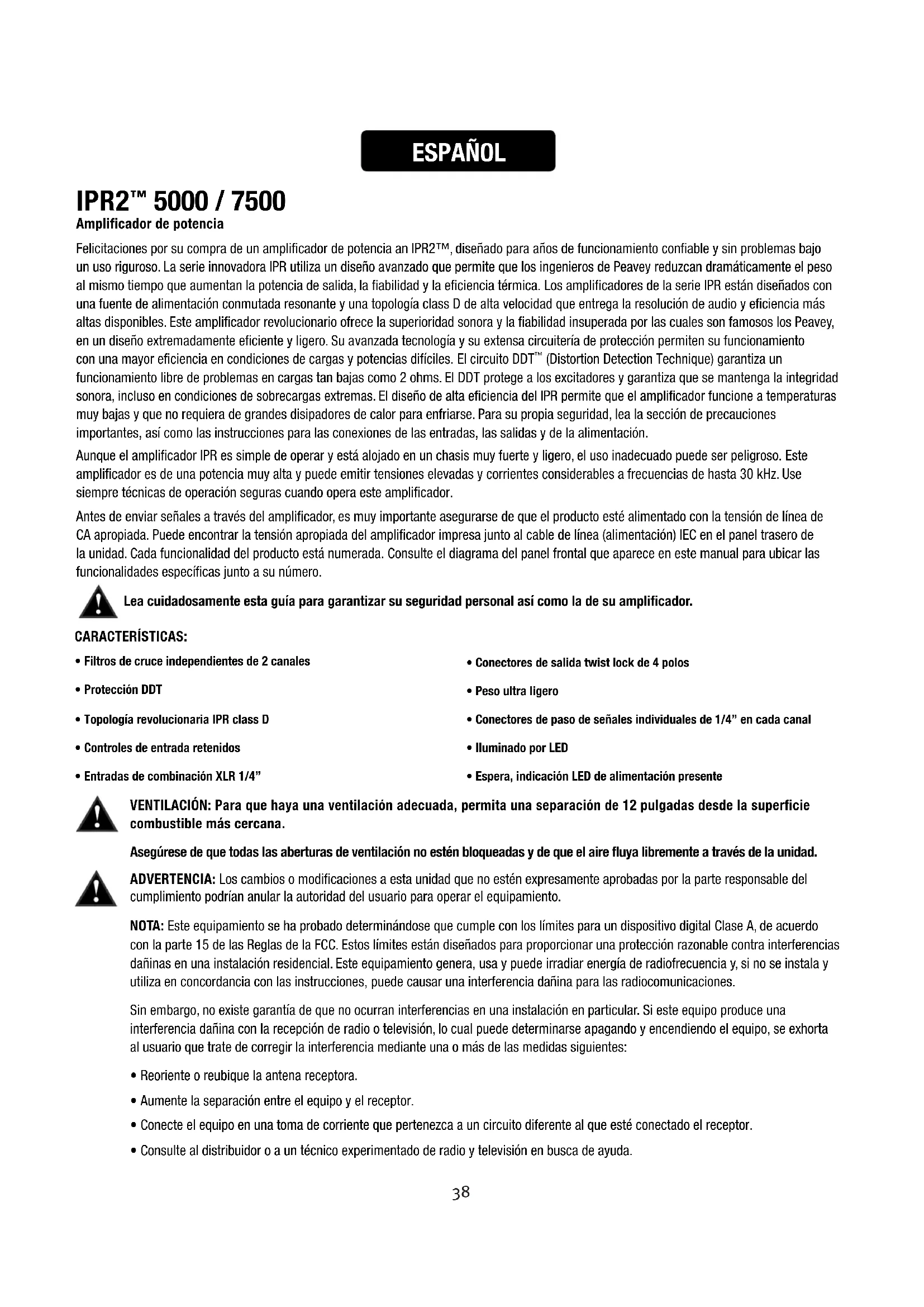 (Distortion Detection Technique) garantiza un funcionamiento libre de problemas en cargas tan bajas como 2 ohms. El DDT protege a los excitadores y garantiza que se mantenga la integridad sonora, incluso en condiciones de sobrecargas extremas. El diseño de alta eficiencia del IPR permite que el amplificador funcione a temperaturas muy bajas y que no requiera de grandes disipadores de calor para enfriarse. Para su propia seguridad, lea la sección de precauciones importantes, así como las instrucciones para las conexiones de las entradas, las salidas y de la alimentación. Aunque el amplificador IPR es simple de operar y está alojado en un chasis muy fuerte y ligero, el uso inadecuado puede ser peligroso. Este amplificador es de una potencia muy alta y puede emitir tensiones elevadas y corrientes considerables a frecuencias de hasta 30 kHz. Use siempre técnicas de operación seguras cuando opera este amplificador. Antes de enviar señales a través del amplificador, es muy importante asegurarse de que el producto esté alimentado con la tensión de línea de CA apropiada. Puede encontrar la tensión apropiada del amplificador impresa junto al cable de línea (alimentación) IEC en el panel trasero de la unidad. Cada funcionalidad del producto está numerada. Consulte el diagrama del panel frontal que aparece en este manual para ubicar las funcionalidades específicas junto a su número. Lea cuidadosamente esta guía para garantizar su seguridad personal así como la de su amplificador. ESPAÑOL VENTILACIÓN: Para que haya una ventilación adecuada, permita una separación de 12 pulgadas desde la superficie combustible más cercana. Asegúrese de que todas las aberturas de ventilación no estén bloqueadas y de que el aire fluya libremente a través de la unidad. CARACTERÍSTICAS: