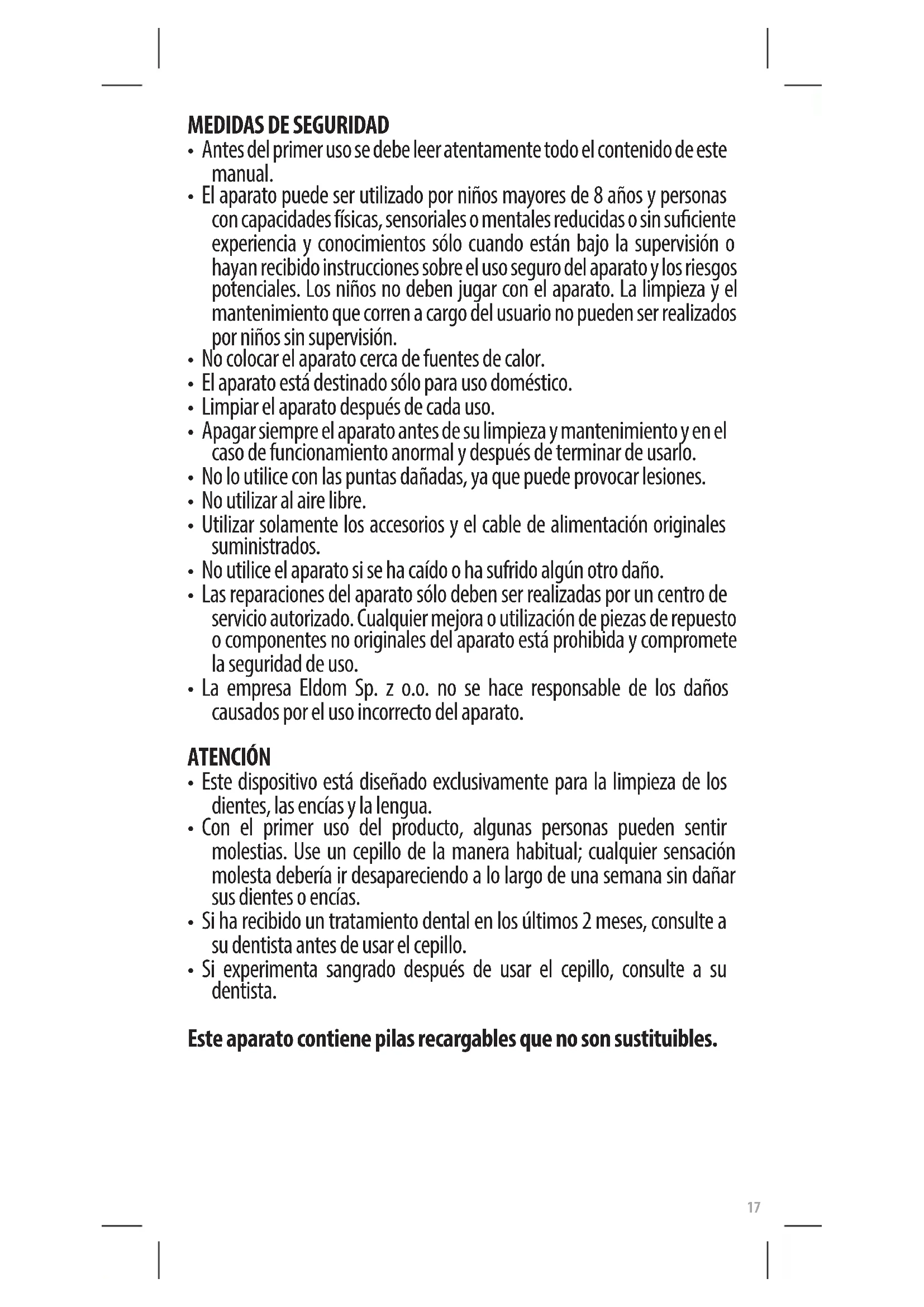 - Si experimenta sangrado después de usar el cepillo, consulte a su dentista. Este aparato contiene pilas recargables que no son sustituibles.18