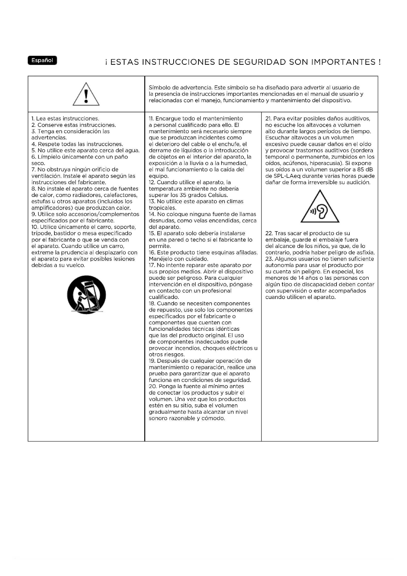 no escuche los altavoces a volumen alto durante largos períodos de tiempo. Escuchar altavoces a un volumen excesivo puede causar daños en el oído y provocar trastornos auditivos (sordera temporal o permanente, zumbidos en los oídos, acúfenos, hiperacusia). Si expone sus oídos a un volumen superior a 85dB de SPL-LAeq durante varias horas puede dañar de forma irreversible su audición.