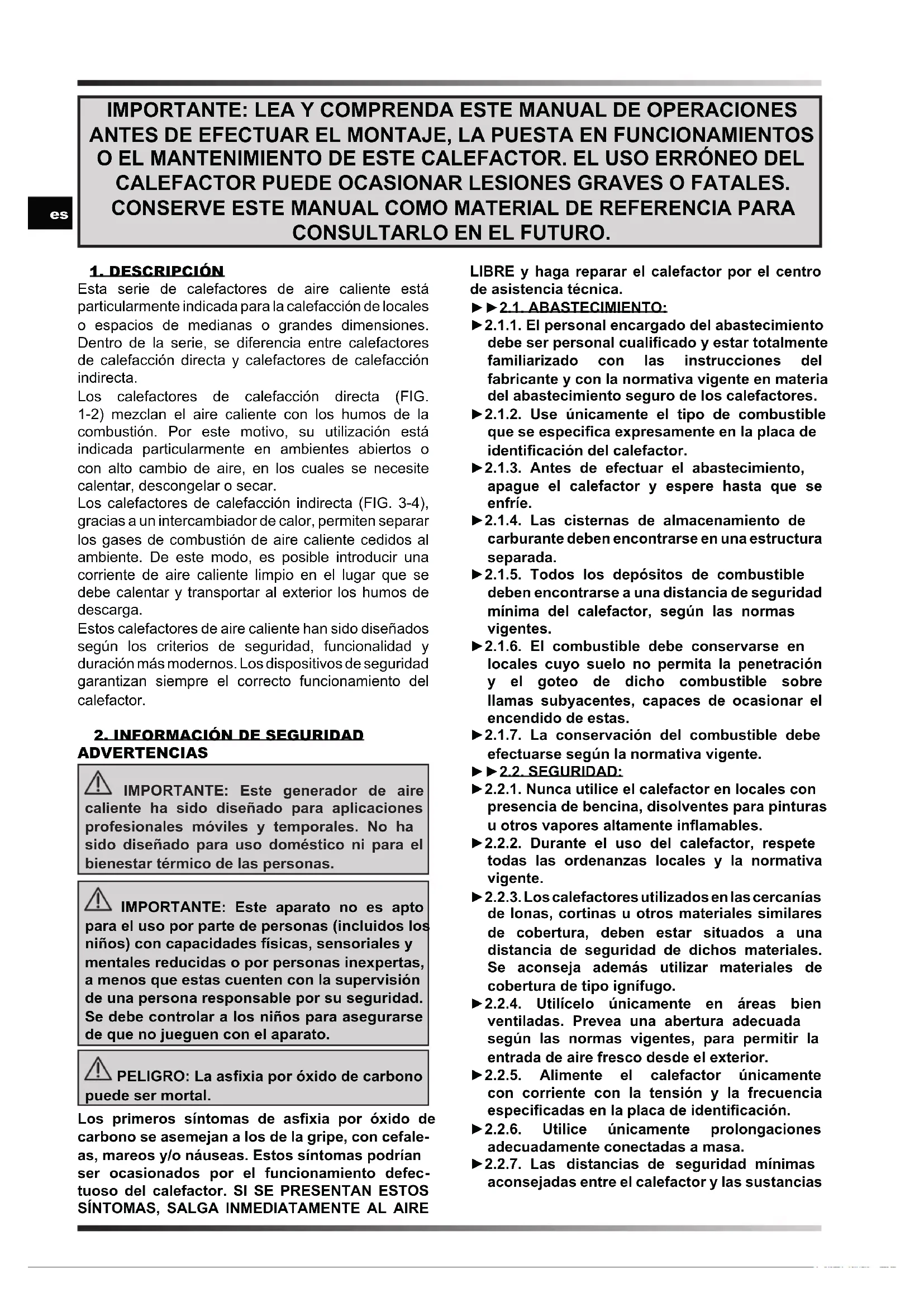 Esta serie de calefactores de aire caliente está particularmente indicada para la calefacción de locales o espacios de medianas o grandes dimensiones. Dentro de la serie, se diferencia entre calefactores de calefacción directa y calefactores de calefacción indirecta. Los calefactores de calefacción directa (FIG. 1-2) mezclan el aire caliente con los humos de la combustión. Por este motivo, su utilización está indicada particularmente en ambientes abiertos o con alto cambio de aire, en los cuales se necesite calentar, descongelar o secar. Los calefactores de calefacción indirecta (FIG. 3-4), gracias a un intercambiador de calor, permiten separar los gases de combustión de aire caliente cedidos al ambiente. De este modo, es posible introducir una corriente de aire caliente limpio en el lugar que se debe calentar y transportar al exterior los humos de descarga. Estos calefactores de aire caliente han sido diseñados según los criterios de seguridad, funcionalidad y duración más modernos. Los dispositivos de seguridad garantizan siempre el correcto funcionamiento del calefactor.