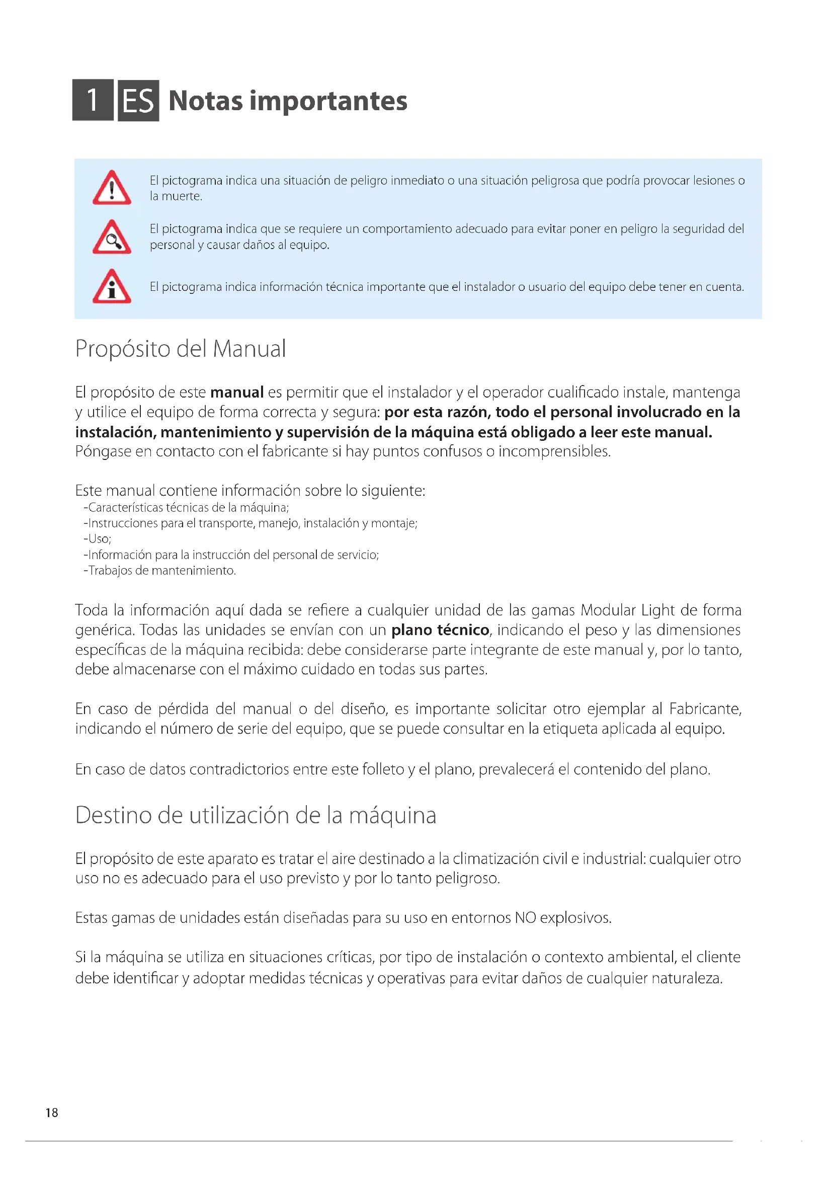 Normas de seguridad Competencias requeridas para el uso y mantenimiento de la máquina Operador genérico: HABILITADO al manejo de la máquina mediante controles situados en el panel de control. Se lleva a cabo únicamente las operaciones de control de la máquina, encendido/apagado Encargado de mantenimiento mecánico (cualificado): HABILITADO para realizar trabajos de mantenimiento, ajuste, sustitución y reparación de componentes mecánicos. Deberá ser una persona competente en sistemas mecánicos y, por lo tanto, capaz de realizar el mantenimiento mecánico de manera satisfactoria y segura; deberá poseer conocimientos teóricos y experiencia manual. NO HABILITADO para trabajar en sistemas eléctricos. Técnico de fabricante (cualificado): HABILITADO para realizar operaciones de carácter complejo en cualquier situación. Trabaja de acuerdo con el usuario. Encargado de mantenimiento eléctrico (cualificado): HABILITADO para efectuar reparaciones eléctricas, ajustes, mantenimiento y reparaciones eléctricas. HABILITADO para trabajar en la presencia de tensión en el interior de los paneles de control y cajas de conexión. Deberá ser una persona competente en electrónica e ingeniería eléctrica, y por lo tanto capaz de intervenir en sistemas eléctricos de manera satisfactoria y segura, deberá tener conocimientos teóricos y experiencia comprobada. NO HABILITADO para trabajos mecánicos. Competencias necesarias para la instalación de la máquina Los instaladores deberán llevar a cabo las operaciones de acuerdo con su cualificación profesional: todas las actividades excluidas de su competencia (por ejemplo, conexiones eléctricas) deberán ser realizadas por operadores específicos y cualificados, a fin de no poner en peligro su propia seguridad y la de otros operadores que interactúen con el equipo. Operador de transporte y manipulación de la máquina: Persona autorizada, con reconocida competencia en el uso de medios de transporte y elevación. Instalador técnico: técnico experto, enviado o autorizado por el fabricante o su representante autorizado con la competencia técnica y formación adecuadas para la instalación de la máquina. Auxiliar: técnico sujeto a tareas de cuidado durante el funcionamiento del equipo de elevación y montaje. Deberá estar debidamente formado e informado sobre las operaciones a realizar y los planes de seguridad de la obra/ instalación. Este manual especifica el técnico competente para cada operación. Los instaladores, usuarios y encargados de mantenimiento NO pueden operar en la máquina si: - carecen de experiencia o responsabilidad o son menores de edad; - presentan impedimentos físicos o un estado psicofísicas no perfecto; - no dominan el ciclo de funcionamiento de la máquina; - no han cursado una formación de preparación teórica/práctica con el apoyo de un operador o conductor de máquina experimen- tado, o con el apoyo de un técnico del fabricante. Este manual especifica el técnico competente para cada operación.20 Antes de la instalación, uso y mantenimiento de la máquina, lea atentamente este manual y guárdelo cuidadosamente para futuras consultas por parte de los distintos operadores. No quite, rasgue o reescriba partes de este manual por ninguna razón. Todas las operaciones de instalación, montaje, conexión a la red eléctrica y mantenimiento ordinario/extraordinario sólo deben ser realizadas por técnicos que cumplan los requisitos legales, después de haber desconectado el aparato eléctricamente y utilizando equipos de protección individual (p. ej., guantes, gafas protectoras, etc.), de acuerdo con las normas vigentes en el país de utilización y de acuerdo con las normas relativas a sistemas y seguridad en el trabajo. La instalación, uso o mantenimiento distintos de los indicados en el manual pueden ocasionar daños, lesiones o muerte, anular la garantía y liberar al Fabricante de cualquier responsabilidad. Durante la manipulación o instalación del aparato, es obligatorio el uso de ropa protectora y medios adecuados para prevenir accidentes y garantizar la protección de la propia seguridad y la de los demás. Durante la instalación o mantenimiento de la máquina, que no se permite el tránsito o estancia de las personas que no participan en la instalación cerca de la zona de trabajo. Antes de realizar cualquier trabajo de instalación o mantenimiento, desconecte el equipo de la fuente de alimentación. Antes de instalar el equipo, compruebe que los sistemas cumplen con la normativa vigente en el país de utilización y con lo indicado en la placa. El usuario/instalador es responsable de garantizar la estabilidad estática y dinámica de la instalación y de organizar las salas de tal forma que las personas no cualicadas y no autorizadas NO tengan acceso a la máquina o a sus mandos. El usuario/instalador es responsable de asegurar que las condiciones climáticas no comprometan la seguridad de personas y cosas durante la instalación, uso y mantenimiento. Asegúrese de que la toma de aire no esté cerca de desagües, humos de combustión u otros contaminantes. NO instale el equipo en lugares expuestos a vientos fuertes, sal, llamas libres o temperaturas superiores a 40°C (104°F). Cuando finalice la instalación, instruya al usuario para que utilice la máquina correctamente. Si el equipo no funciona o si observa cambios funcionales o estructurales, desconéctelo de la fuente de alimentación y póngase en contacto con un centro de servicio autorizado por el fabricante o distribuidor sin intentar repararlo usted mismo. Para posibles sustituciones, por favor, solicítenos únicamente piezas de recambio originales. Las intervenciones, manipulaciones o modificaciones no autorizadas expresamente que no se ajusten al contenido de este manual anularán la garantía y pueden causar daños, lesiones o accidentes, incluso mortales. La placa de la unidad proporciona una importante información técnica: es 