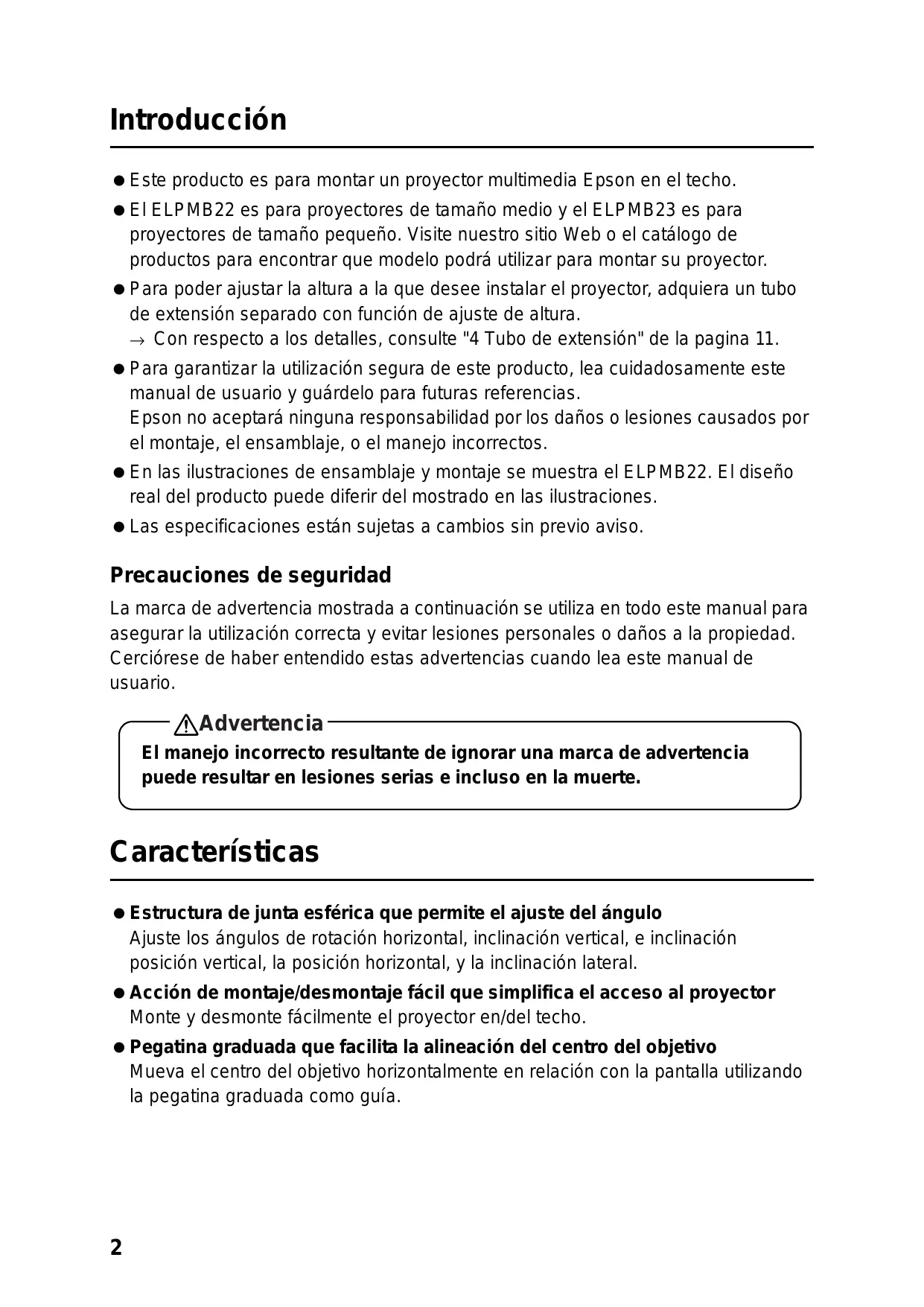 Este producto es para montar un proyector multimedia Epson en el techo. El ELPMB22 es para proyectores de tamaño medio y el ELPMB23 es para proyectores de tamaño pequeño. Visite nuestro sitio Web o el catálogo de productos para encontrar que modelo podrá utilizar para montar su proyector. Para poder ajustar la altura a la que desee instalar el proyector, adquiera un tubo de extensión separado con función de ajuste de altura. → Con respecto a los detalles, consulte "4 Tubo de extensión" de la pagina 11. Para garantizar la utilización segura de este producto, lea cuidadosamente este manual de usuario y guárdelo para futuras referencias. Epson no aceptará ninguna responsabilidad por los daños o lesiones causados por el montaje, el ensamblaje, o el manejo incorrectos. En las ilustraciones de ensamblaje y montaje se muestra el ELPMB22. El diseño real del producto puede diferir del mostrado en las ilustraciones. Las especificaciones están sujetas a cambios sin previo aviso.