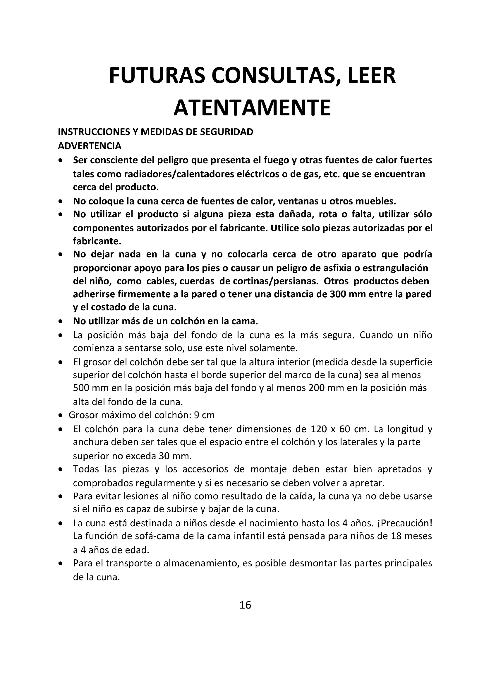 - Para evitar lesiones al niño como resultado de la caída, la cuna ya no debe usarse si el niño es capaz de subirse y bajar de la cuna.