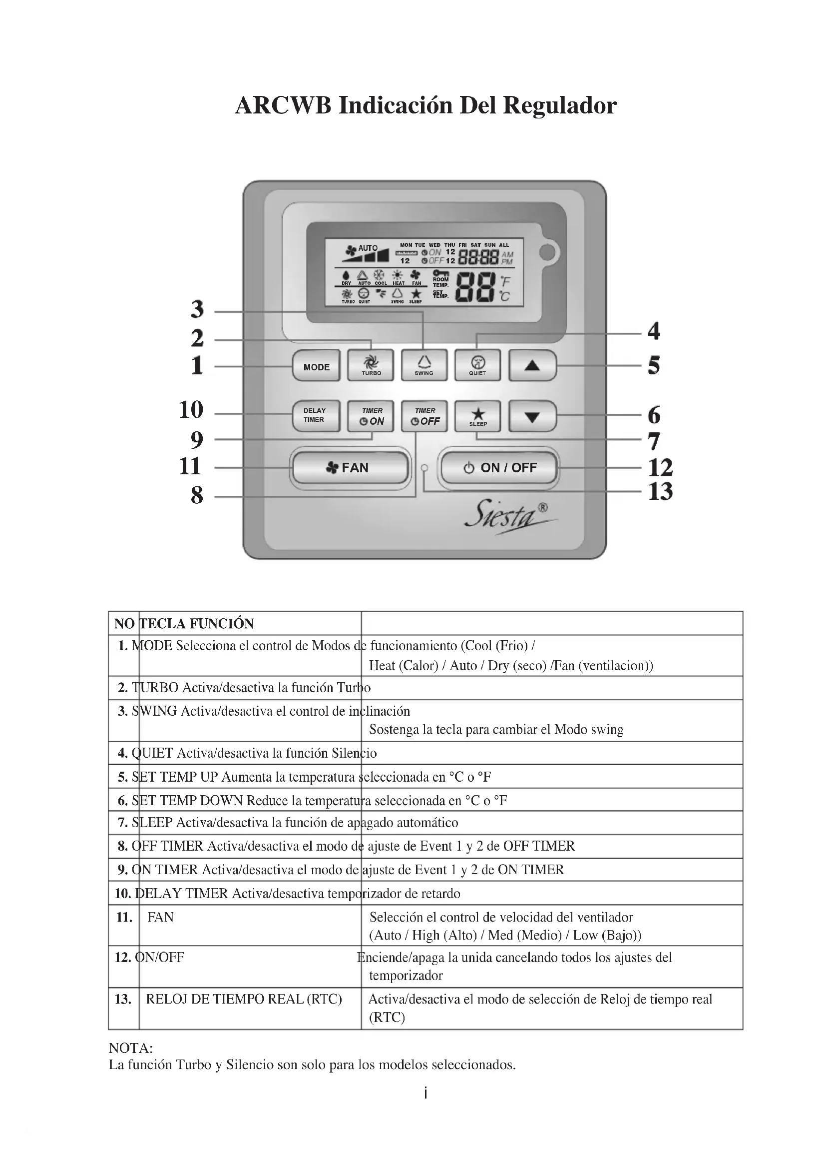 (RTC) NOTA: La función Turbo y Silencio son solo para los modelos seleccionados. ARCWB Indicación Del Regulador MODE TURBODELAYTIMERTIMER ON OFF TIMER
