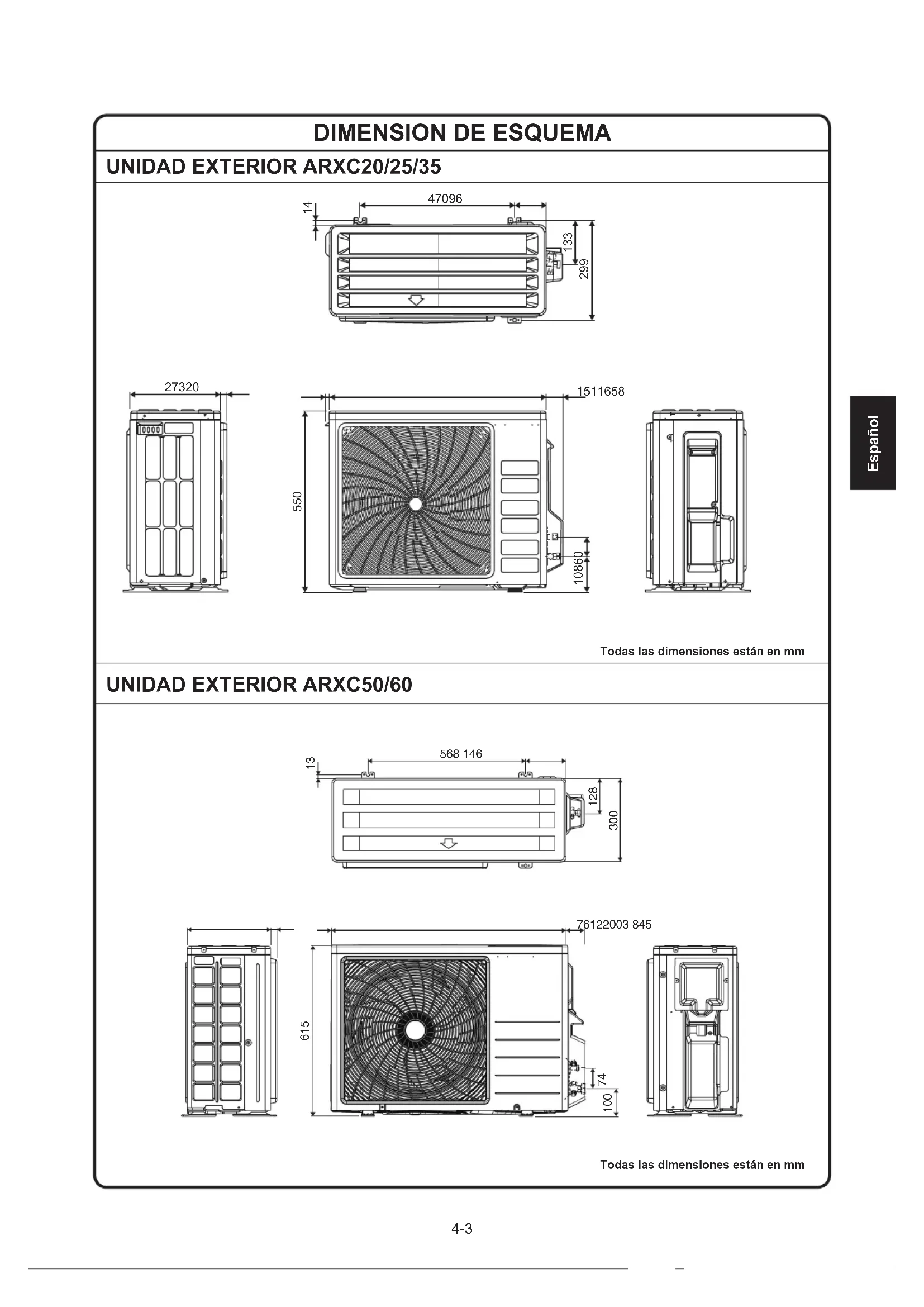 PLACA DE NOMBRE DE MODELO DEBAJO DEBAJO TRASERA TRASERA Todas las dimensiones están en mm Todas las dimensiones están en mm4-3 Español