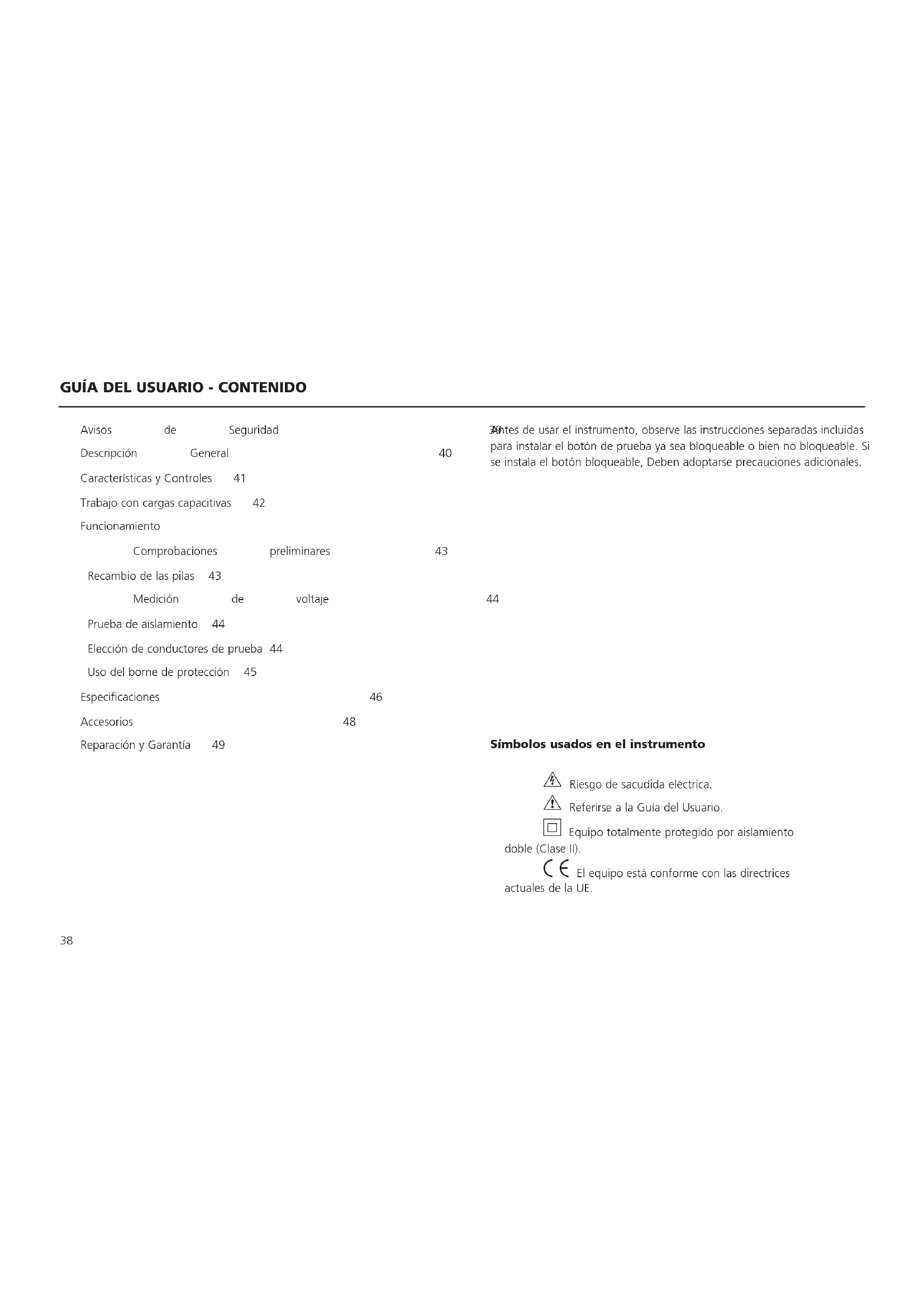 Avisos de Seguridad 39 Descripción General 40 Características y Controles 41 Trabajo con cargas capacitivas 42 Funcionamiento Comprobaciones preliminares 43 Recambio de las pilas 43 Medición de voltaje 44 Prueba de aislamiento 44 Elección de conductores de prueba 44 Uso del borne de protección 45 Especificaciones 46 Accesorios 48 Reparación y Garantía 49 Antes de usar el instrumento, observe las instrucciones separadas incluidas para instalar el botón de prueba ya sea bloqueable o bien no bloqueable. Si se instala el botón bloqueable, Deben adoptarse precauciones adicionales. Símbolos usados en el instrumento F Riesgo de sacudida eléctrica. G Referirse a la Guía del Usuario. t Equipo totalmente protegido por aislamiento doble (Clase II). c El equipo está conforme con las directrices actuales de la UE.39