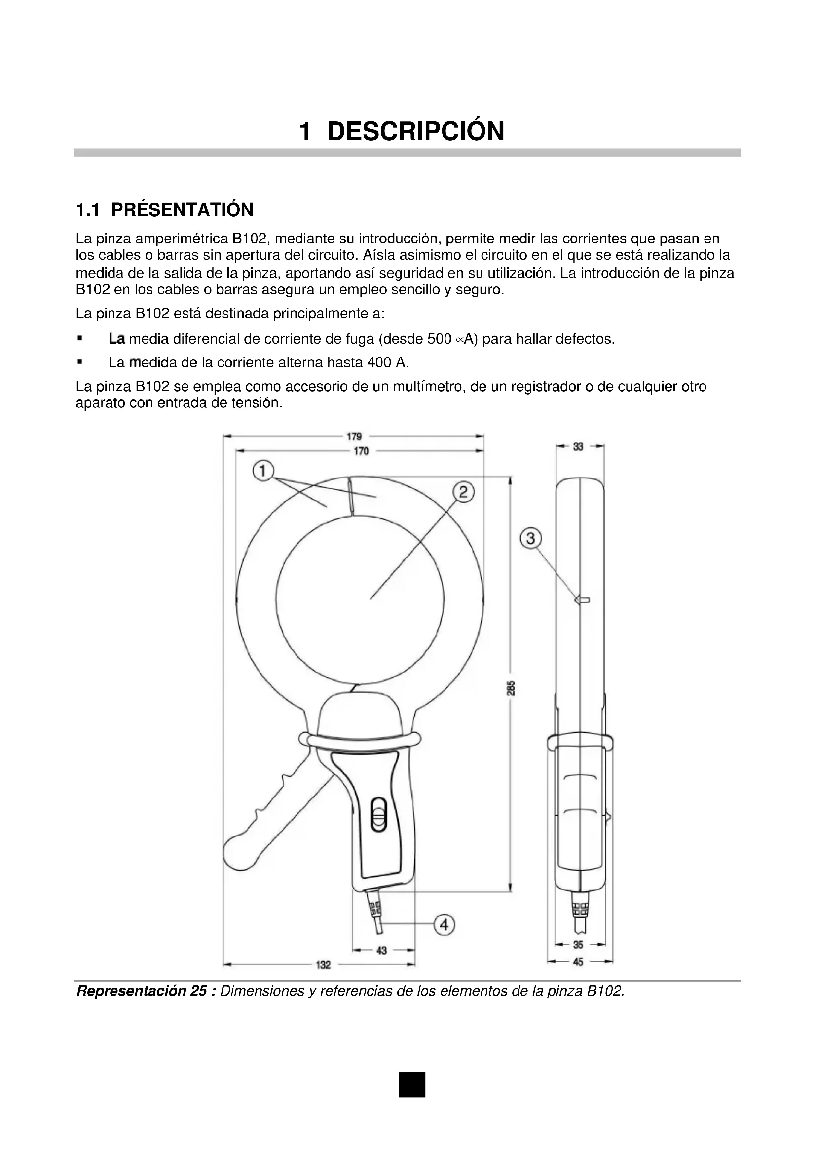 La medida de la corriente alterna hasta 400 A. La pinza B102 se emplea como accesorio de un multímetro, de un registrador o de cualquier otro aparato con entrada de tensión. Representación 25 : Dimensiones y referencias de los elementos de la pinza B102.49 Los elementos se reparten como sigue (representación 1):
