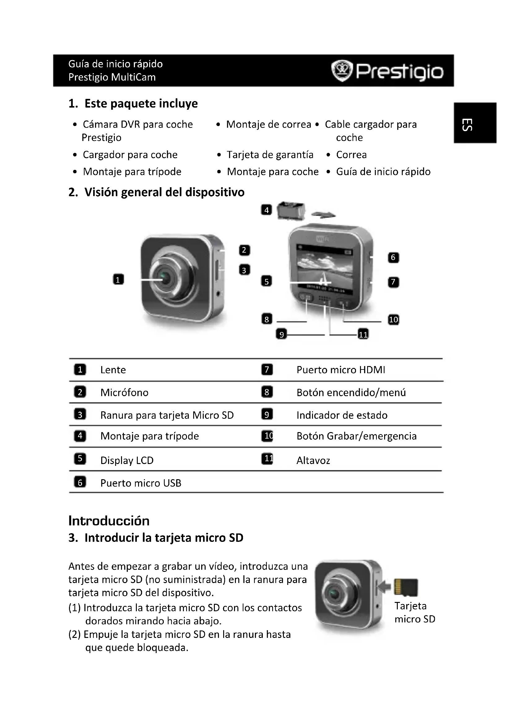 Tarjeta micro SD Antes de empezar a grabar un vídeo, introduzca una tarjeta micro SD (no suministrada) en la ranura para tarjeta micro SD del dispositivo. (1) Introduzca la tarjeta micro SD con los contactos dorados mirando hacia abajo. (2) Empuje la tarjeta micro SD en la ranura hasta que quede bloqueada.Guía de inicio rápido Prestigio MultiCam