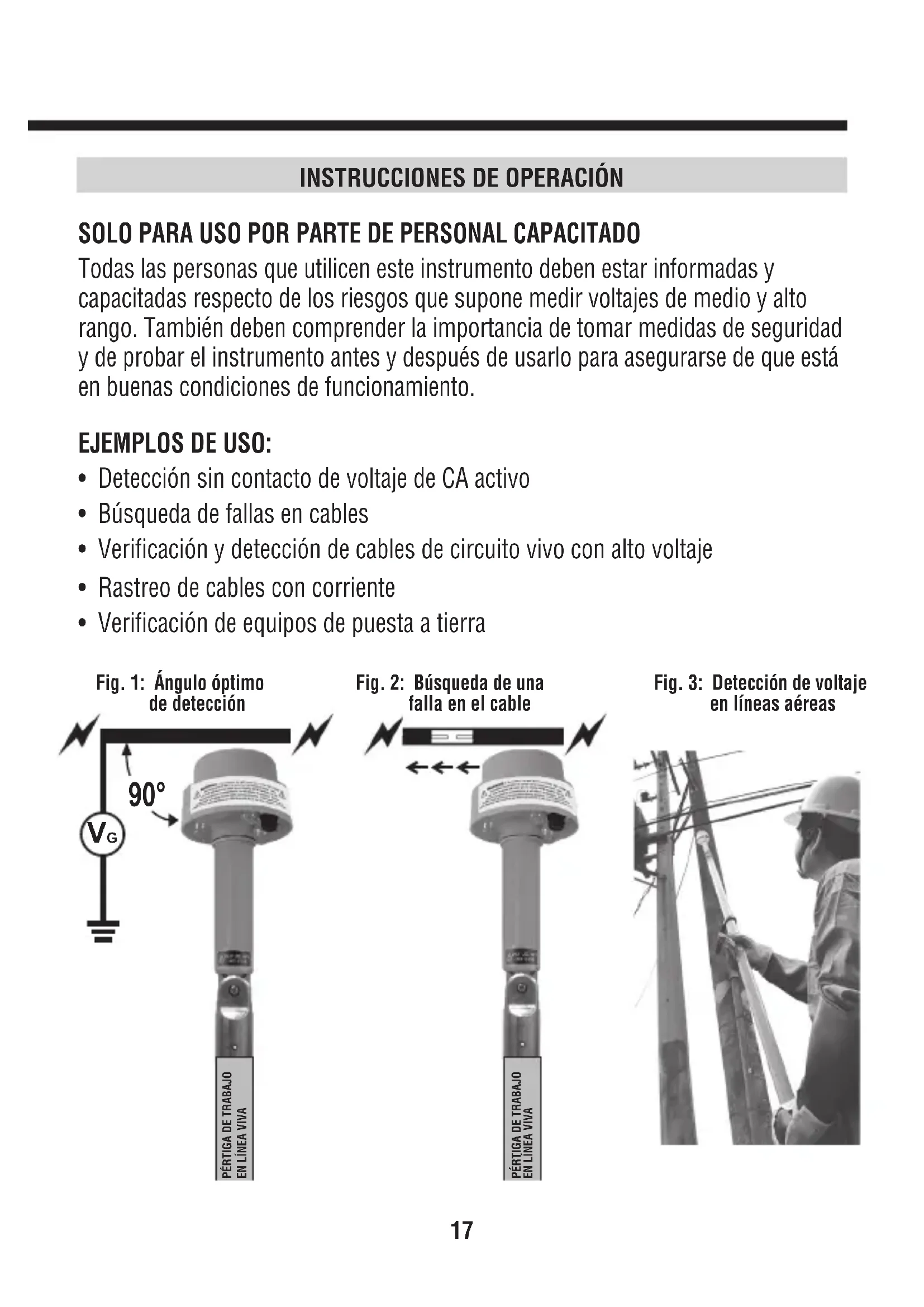 al ajuste adecuado. Se recomienda comenzar con un ajuste de prueba menor que el voltaje de trabajo real, y luego ir aumentando el valor gradualmente hasta que el instrumento detecte el voltaje. Mueva el probador lentamente hacia el conductor activo hasta que se dispare la señal de advertencia. Consulte la Fig. 1 de la página 17 para conocer el ángulo óptimo de detección. Siempre mantenga la distancia mínima de proximidad especificada en las Tablas R-6 y R-7 de la OSHA, que se encuentran en las páginas 20 y 21 de este manual. BÚSquEDa DE faLLaS En CaBLES El probador puede utilizarse para buscar fallas en algunos cables flexibles. Gire la perilla del selector de sensibilidad
