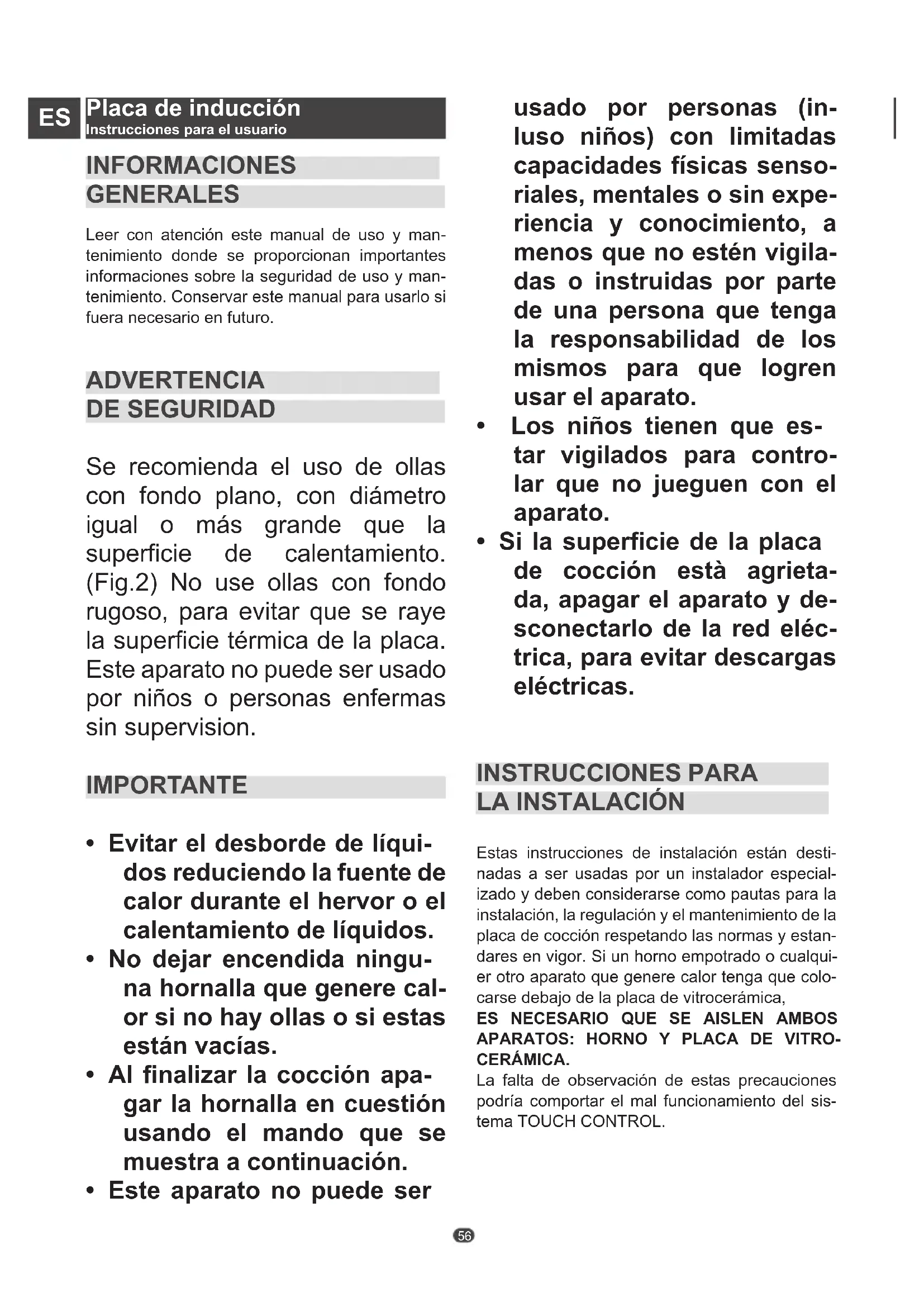 INFORMACIONES GENERALES Leer con atención este manual de uso y man- tenimiento donde se proporcionan importantes informaciones sobre la seguridad de uso y man- tenimiento. Conservar este manual para usarlo si fuera necesario en futuro. ADVERTENCIA DE SEGURIDAD Se recomienda el uso de ollas con fondo plano, con diámetro igual o más grande que la superficie de calentamiento. (Fig.2) No use ollas con fondo rugoso, para evitar que se raye la superficie térmica de la placa. Este aparato no puede ser usado por niños o personas enfermas sin supervision. IMPORTANTE