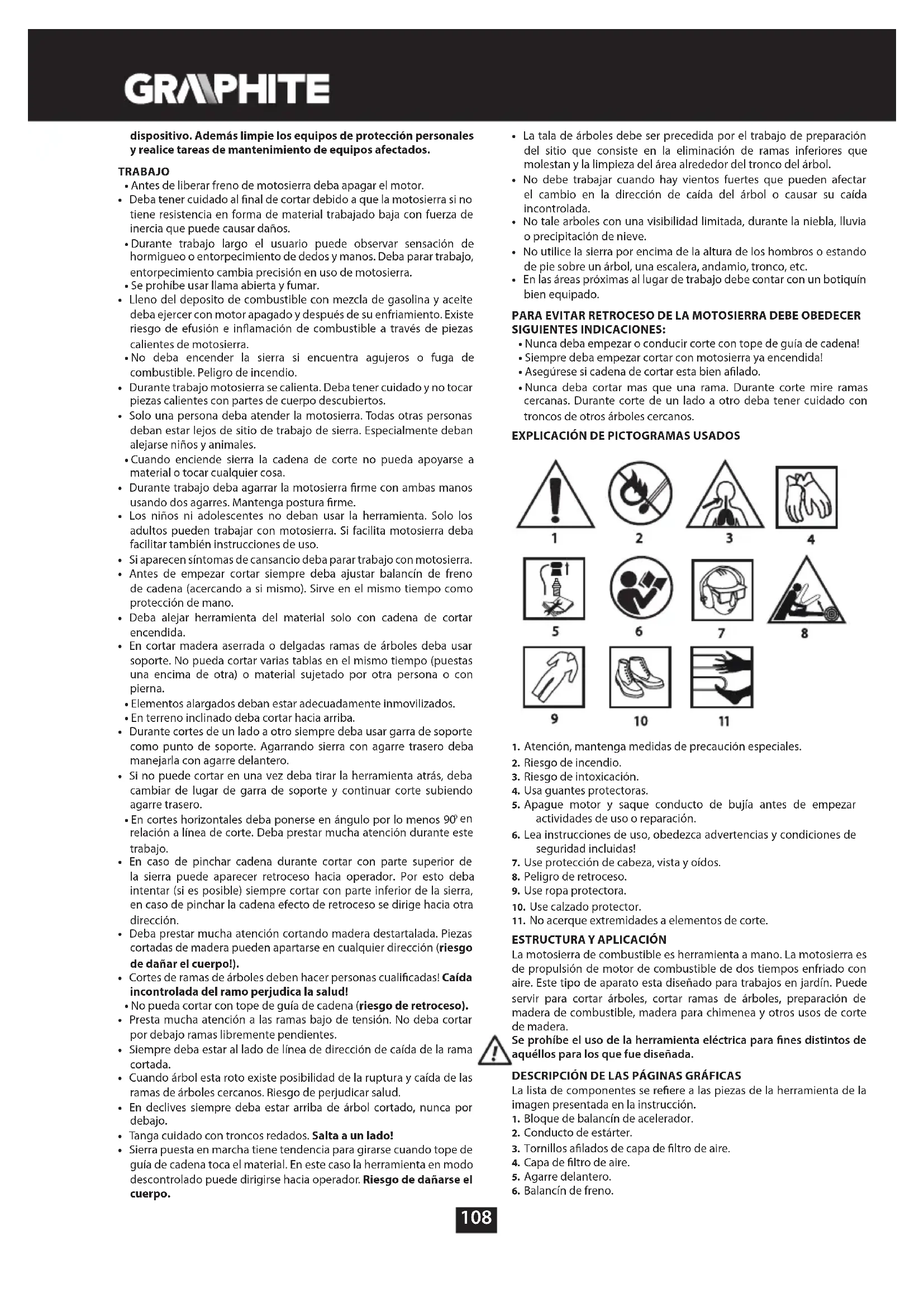 La motosierra de combustible es herramienta a mano. La motosierra es de propulsión de motor de combustible de dos tiempos enfriado con aire. Este tipo de aparato esta diseñado para trabajos en jardín. Puede servir para cortar árboles, cortar ramas de árboles, preparación de madera de combustible, madera para chimenea y otros usos de corte de madera. Se prohíbe el uso de la herramienta eléctrica para nes distintos de aquéllos para los que fue diseñada. DESCRIPCIÓN DE LAS PÁGINAS GRÁFICAS La lista de componentes se reere a las piezas de la herramienta de la imagen presentada en la instrucción.