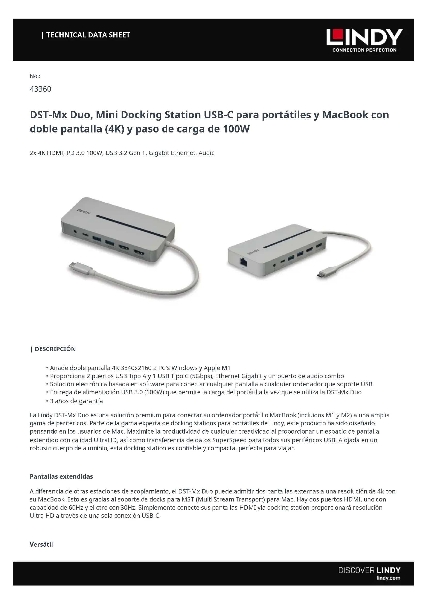 DST-Mx Duo, Mini Docking Station USB-C para portátiles y MacBook con doble pantalla (4K) y paso de carga de 100W 2x 4K HDMI, PD 3.0 100W, USB 3.2 Gen 1, Gigabit Ethernet, Audio Añade doble pantalla 4K 3840x2160 a PC's Windows y Apple M1 Proporciona 2 puertos USB Tipo A y 1 USB Tipo C (5Gbps), Ethernet Gigabit y un puerto de audio combo Solución electrónica basada en software para conectar cualquier pantalla a cualquier ordenador que soporte USB Entrega de alimentación USB 3.0 (100W) que permite la carga del portátil a la vez que se utiliza la DST-Mx Duo 3 años de garantía La Lindy DST-Mx Duo es una solución premium para conectar su ordenador portátil o MacBook (incluidos M1 y M2) a una amplia gama de periféricos. Parte de la gama experta de docking stations para portátiles de Lindy, este producto ha sido diseñado pensando en los usuarios de Mac. Maximice la productividad de cualquier creatividad al proporcionar un espacio de pantalla extendido con calidad UltraHD, así como transferencia de datos SuperSpeed para todos sus periféricos USB. Alojada en un robusto cuerpo de aluminio, esta docking station es confiable y compacta, perfecta para viajar. Pantallas extendidas A diferencia de otras estaciones de acoplamiento, el DST-Mx Duo puede admitir dos pantallas externas a una resolución de 4k con su MacBook. Esto es gracias al soporte de docks para MST (Multi Stream Transport) para Mac. Hay dos puertos HDMI, uno con capacidad de 60Hz y el otro con 30Hz. Simplemente conecte sus pantallas HDMI yla docking station proporcionará resolución Ultra HD a través de una sola conexión USB-C. Versátil