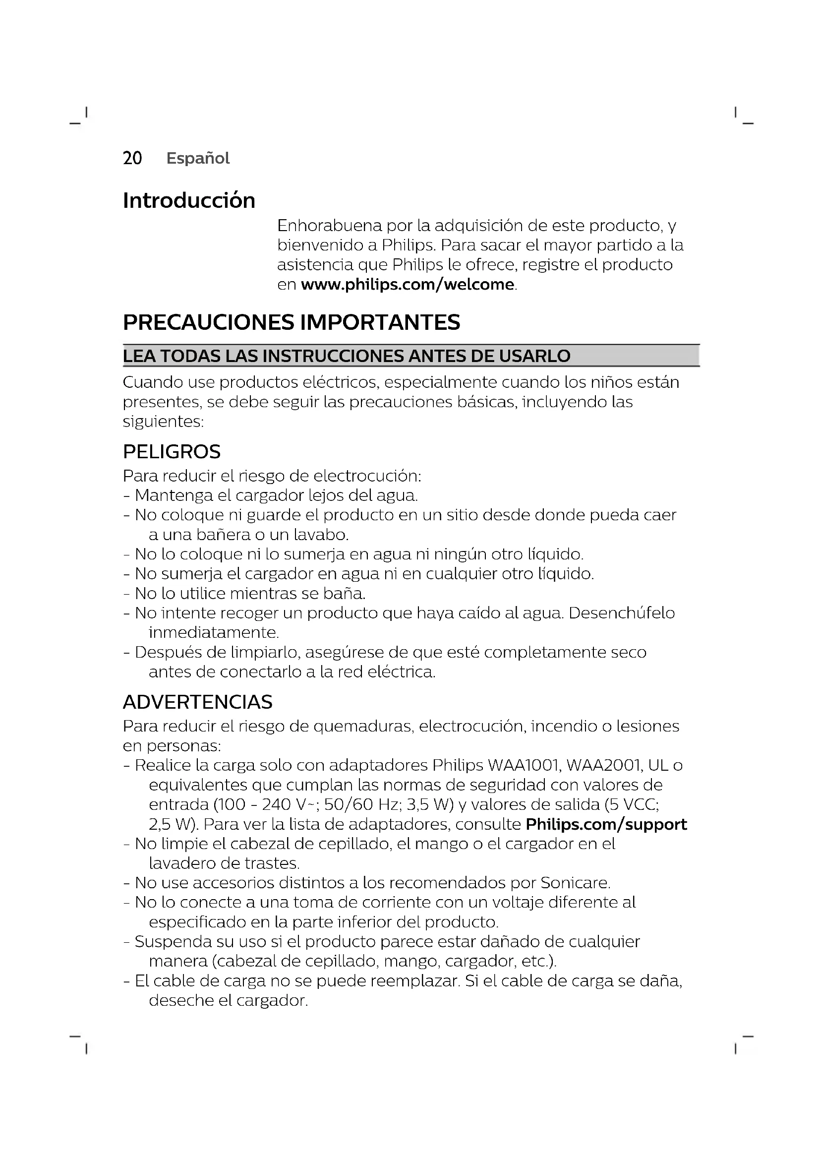Español Introducción Enhorabuena por la adquisición de este producto, y bienvenido a Philips. Para sacar el mayor partido a la asistencia que Philips le ofrece, registre el producto en www.philips.com/welcome. PRECAUCIONES IMPORTANTES LEA TODAS LAS INSTRUCCIONES ANTES DE USARLO Cuando use productos eléctricos, especialmente cuando los niños están presentes, se debe seguir las precauciones básicas, incluyendo las siguientes: PELIGROS Para reducir el riesgo de electrocución: - Mantenga el cargador lejos del agua. - No coloque ni guarde el producto en un sitio desde donde pueda caer a una bañera o un lavabo. - No lo coloque ni lo sumerja en agua ni ningún otro líquido. - No sumerja el cargador en agua ni en cualquier otro líquido. - No lo utilice mientras se baña. - No intente recoger un producto que haya caído al agua. Desenchúfelo inmediatamente. - Después de limpiarlo, asegúrese de que esté completamente seco antes de conectarlo a la red eléctrica. ADVERTENCIAS Para reducir el riesgo de quemaduras, electrocución, incendio o lesiones en personas: - Realice la carga solo con adaptadores Philips WAA1001, WAA2001, UL o equivalentes que cumplan las normas de seguridad con valores de entrada (100 - 240V~; 50/60Hz; 3,5W) y valores de salida (5VCC; 2,5W). Para ver la lista de adaptadores, consulte Philips.com/support - No limpie el cabezal de cepillado, el mango o el cargador en el lavadero de trastes. - No use accesorios distintos a los recomendados por Sonicare. - No lo conecte a una toma de corriente con un voltaje diferente al especificado en la parte inferior del producto. - Suspenda su uso si el producto parece estar dañado de cualquier manera (cabezal de cepillado, mango, cargador, etc.). - El cable de carga no se puede reemplazar. Si el cable de carga se daña, deseche el cargador.21 Español - Siempre reemplace el cargador con uno del tipo original para evitar cualquier peligro. - Mantenga el cable lejos de superficies calientes. - No utilice la base para cargar en exteriores. - No utilice el cargador si éste se ha caído al agua. - Este producto no contiene piezas que puedan ser reparadas por el usuario. Si el producto no funciona correctamente o necesita reparación, consulte la sección "Garantía y asistencia". - Mantenga el cepillo Philips Sonicare alejado de la luz solar directa. - Utilice este producto solo para el uso al que está destinado tal y como se describe en este documento o siguiendo las recomendaciones de su dentista. - Este producto no debe ser usado por personas (adultos o niños) con su capacidad física, psíquica o sensorial reducida, ni por quienes no tengan los conocimientos y la experiencia necesarios, a menos que sean supervisados o instruidos acerca del uso del aparato por una persona responsable de su seguridad. - Evite que los niños jueguen con este producto. - Philips Sonicare es un dispositivo de aseo personal y no se debe usar con diferentes pacientes en ningún consultorio o clínica dental. - Este producto no está diseñado para que el personal de servicio lo repare en caso de que falle o de que algún componente tenga un defecto (la unidad puede desecharse). - Para ponerse en contacto con un proveedor fuera de EE. UU., use un cargador con la configuración apropiada para la toma de corriente. - Este dispositivo ha sido diseñado solamente para la limpieza de dientes, encías y lengua. No lo utilice para ningún otro propósito. Deje de usar el dispositivo y contacte a su médico si experimenta cualquier incomodidad o dolor. - Evite el contacto directo con los productos que contengan aceites esenciales o aceite de coco. Este tipo de contacto puede causar que se desprendan las cerdas. - Si su pasta de dientes contiene peróxido, bicarbonato de sodio u otro bicarbonato (frecuentes en los productos blanqueadores), limpie bien el cabezal del cepillo y el mango con agua y jabón después de cada uso. De lo contrario, el plástico podría agrietarse.