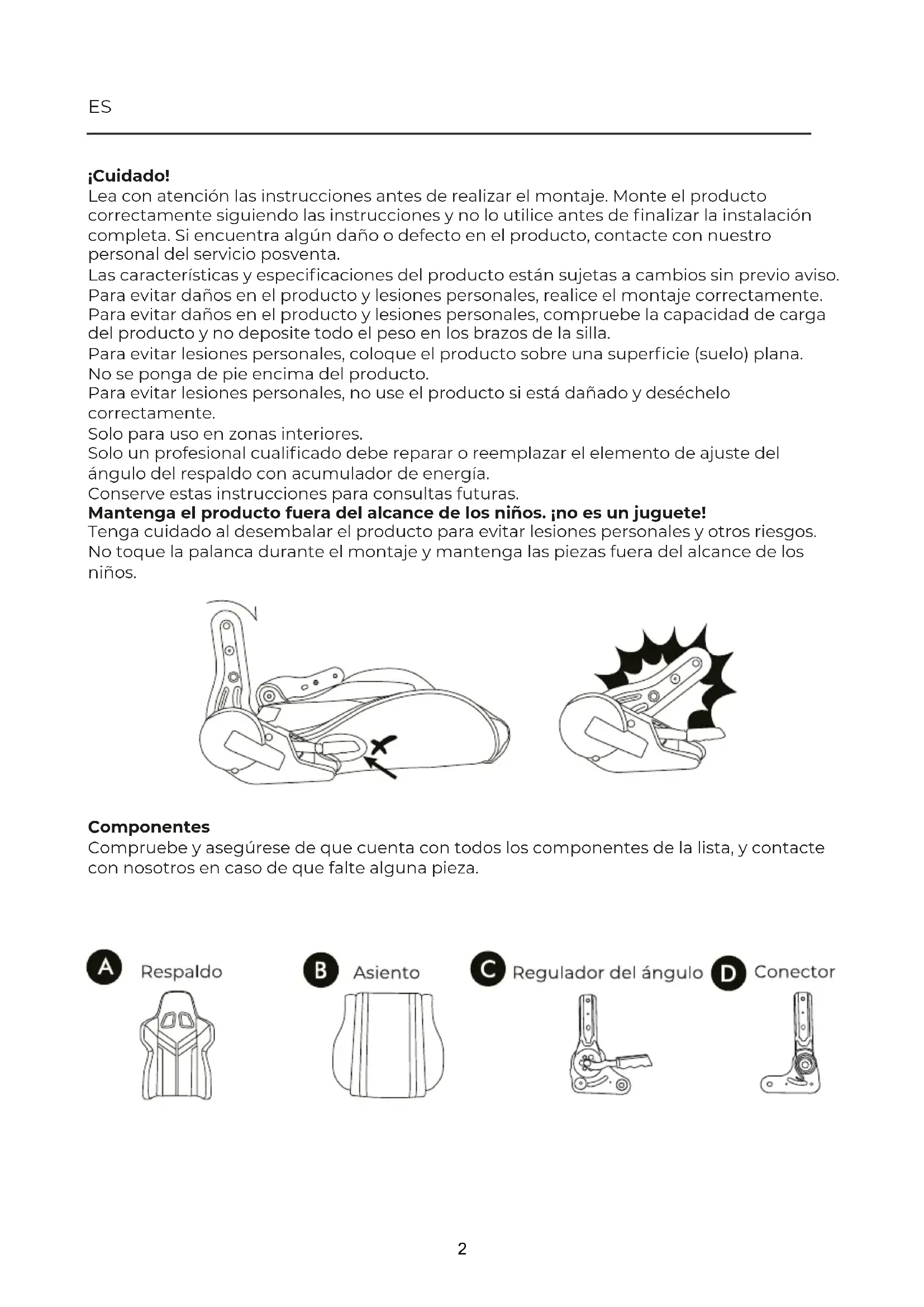 PREDATORES ¡Cuidado! Lea con atención las instrucciones antes de realizar el montaje. Monte el producto correctamente siguiendo las instrucciones y no lo utilice antes de finalizar la instalación completa. Si encuentra algún daño o defecto en el producto, contacte con nuestro personal del servicio posventa. Las características y especificaciones del producto están sujetas a cambios sin previo aviso. Para evitar daños en el producto y lesiones personales, realice el montaje correctamente. Para evitar daños en el producto y lesiones personales, compruebe la capacidad de carga del producto y no deposite todo el peso en los brazos de la silla. Para evitar lesiones personales, coloque el producto sobre una superficie (suelo) plana. No se ponga de pie encima del producto. Para evitar lesiones personales, no use el producto si está dañado y deséchelo correctamente. Solo para uso en zonas interiores. Solo un profesional cualificado debe reparar o reemplazar el elemento de ajuste del ángulo del respaldo con acumulador de energía. Conserve estas instrucciones para consultas futuras. Mantenga el producto fuera del alcance de los niños. ¡no es un juguete! Tenga cuidado al desembalar el producto para evitar lesiones personales y otros riesgos. No toque la palanca durante el montaje y mantenga las piezas fuera del alcance de los niños. Componentes Compruebe y asegúrese de que cuenta con todos los componentes de la lista, y contacte con nosotros en caso de que falte alguna pieza. 2Instalación Tapones 1-Una las ruedecitas a la base de cinco patas, instale el pistón de gas y coloque la tapa de plástico. 2-Fije los reposabrazos a la base del asiento 33-Fije el regulador del ángulo (C) a la derecha del asiento. 5-Una el respaldo al asiento, apretando los tornillos de ambos lados. (Importante: No apriete con fuerza solo los tornillos de un lado, de lo contrario será difícil apretar los del otro lado). 6-Fije las tapas de plástico (E y F) a la parte derecha del respaldo. 7-Fije las tapas de plástico (G y H) a la parte izquierda del respaldo. 4-Fije el conector (D) a la izquierda. 4Funcionamiento 8-Introduzca el pistón de gas en la unidad de control. Fije la unidad de control a la base del asiento. (Importante: La palanca de la unidad de control debe quedar a la derecha) l-Capacidad de carga: hasta 136 kg 9-Introduzca el pistón de gas en la unidad de control. 2-Ajuste de la altura del asiento (ajustar con la palanca de la derecha). 3-Tire de la palanca para activar la función de reclinado. lntrodúzcala para bloquear la posición. 4-Giro 360º 5Instalación Función de reclinado Rotación en el sentido de las agujas del reloj. Ángulo de oscilación 0-10º Rotación en sentido contrario a las agujas del reloj. Ángulo de oscilación 0-30º Rotación en el sentido de las agujas del reloj. Ángulo de oscilación 0-10º Rotación en sentido contrario a las agujas del reloj. Ángulo de oscilación 0-30º Método 1 Colocación del cojín cervical Método 2 Colocación del cojín cervical Introduzca la banda elástica a través del orificio de plástico y ajústela. Coloque el cojín cervical en el respaldo de la silla. 6Instrucciones durante el uso