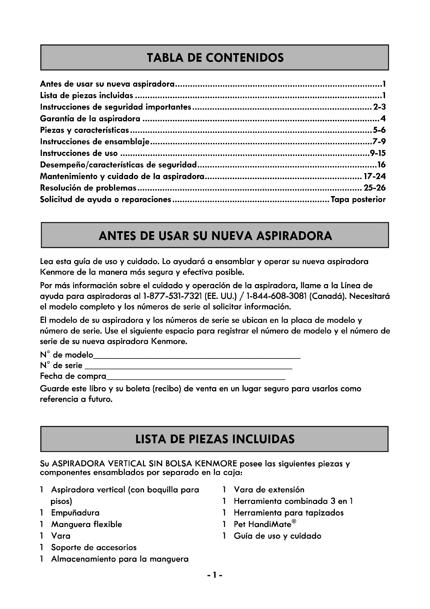 Lea esta guía de uso y cuidado. Lo ayudará a ensamblar y operar su nueva aspiradora Kenmore de la manera más segura y efectiva posible. Por más información sobre el cuidado y operación de la aspiradora, llame a la Línea de ayuda para aspiradoras al 1-877-531-7321 (EE. UU.) / 1-844-608-3081 (Canadá). Necesitará el modelo completo y los números de serie al solicitar información. El modelo de su aspiradora y los números de serie se ubican en la placa de modelo y número de serie. Use el siguiente espacio para registrar el número de modelo y el número de serie de su nueva aspiradora Kenmore. N° de modelo____________________________________________ N° de serie ____________________________________________ Fecha de compra______________________________________ Guarde este libro y su boleta (recibo) de venta en un lugar seguro para usarlos como referencia a futuro.