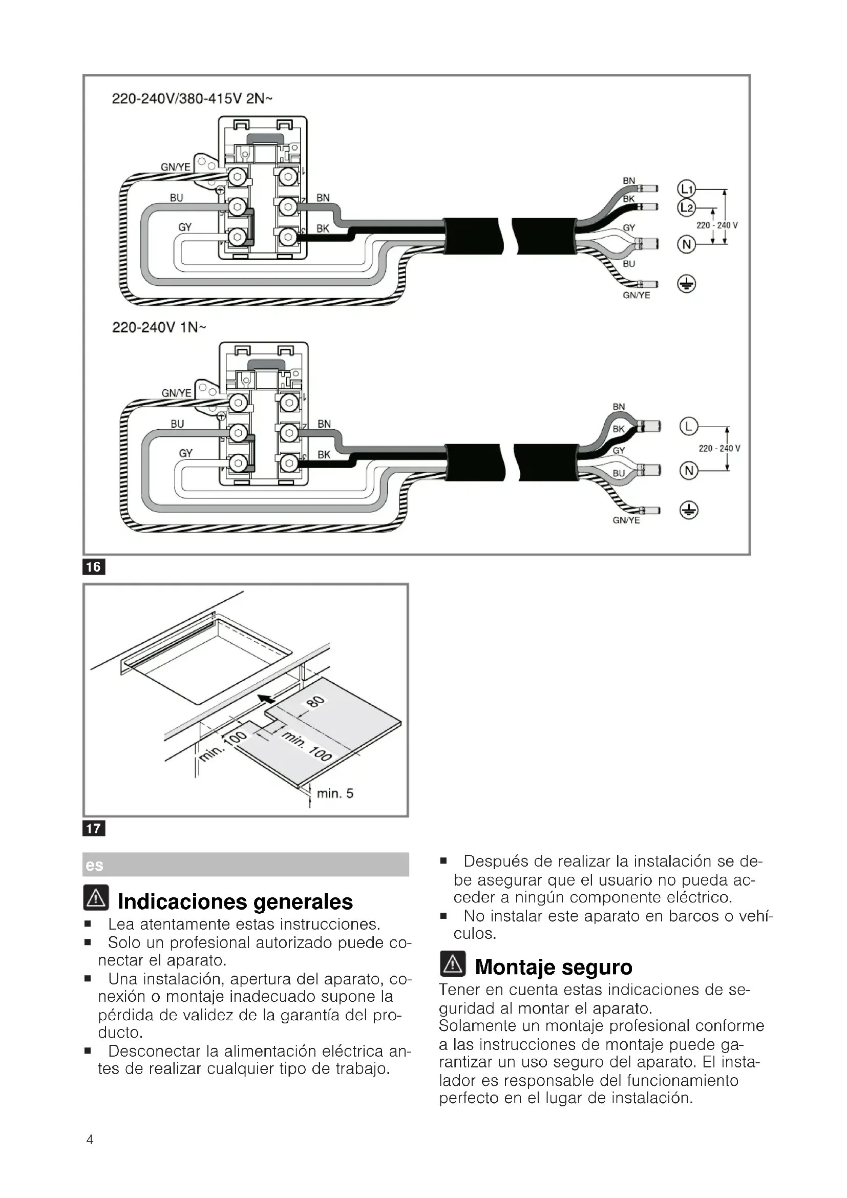 Indicaciones generales ¡ Lea atentamente estas instrucciones. ¡ Solo un profesional autorizado puede co- nectar el aparato. ¡ Una instalación, apertura del aparato, co- nexión o montaje inadecuado supone la pérdida de validez de la garantía del pro- ducto. ¡ Desconectar la alimentación eléctrica an- tes de realizar cualquier tipo de trabajo. ¡ Después de realizar la instalación se de- be asegurar que el usuario no pueda ac- ceder a ningún componente eléctrico. ¡ No instalar este aparato en barcos o vehí- culos. Montaje seguro Tener en cuenta estas indicaciones de se- guridad al montar el aparato. Solamente un montaje profesional conforme a las instrucciones de montaje puede ga- rantizar un uso seguro del aparato. El insta- lador es responsable del funcionamiento perfecto en el lugar de instalación.5 ADVERTENCIA‒¡Peligro: magnetismo! El aparato contiene imanes permanentes. Estos pueden repercutir en el correcto fun- cionamiento de implantes electrónicos co- mo marcapasos o bombas de insulina. ▶ Las personas con implantes electrónicos deberán mantener una distancia mínima de 10cm respecto al aparato. ADVERTENCIA‒¡Riesgo de lesiones! Las piezas que estén accesibles durante el montaje pueden tener los bordes afilados o causar cortes al tocarlas. ▶ Usar guantes de protección. Los productos químicos pueden ser peligro- sos. Para manipular los productos quími- cos, es necesario seguir las recomendacio- nes de los fabricantes de dichos productos. ▶ Llevar puesto el equipo de protección. Indicaciones relativas a la conexión eléctrica Para conectar electricamente el aparato de forma segura, consultar estas indicaciones. ¡ Sólo un profesional autorizado o un técnico del Servicio de Asistencia con formación específica puede conectar el aparato. Se tendrá que regir por las disposiciones de la compañía abastecedo- ra de la electricidad de la zona. ¡ El aparato debe ser conectado a la instalación fija y deben ser incorporados medios de desconexión a la instalación fija de acuerdo a las reglamenta- ciones de la instalación. ¡ El fabricante no asume responsabilidad alguna por fallos de funcionamiento o posibles daños de- rivados de una mala instalación eléctrica. Tipo de conexión ¡ El aparato pertenece a la clase de protección 1. Por esta razón, solo puede utilizarse conectado a una conexión con conductor de toma a tierra. Cable de alimentación Puede estar conectado en la caja de conexión de la placa de cocción o suministrado con el aparato. ¡ Los datos de conexión necesarios están indica- dos en la placa de características y en los esque- mas de conexión. ¡ Utilizar únicamente el cable de conexión suminis- trado con el aparato o por el Servicio de Asisten- cia Técnica. En caso de necesitar un cable de mayor longitud contacte con el Servicio de Asis- tencia Técnica. Disponible hasta 2,20 m Indicaciones relativas al mueble de montaje ¡ Las placas de inducción solo pueden ser instala- das sobre cajón u hornos con ventilación forzada. Debajo de la placa de cocción no se pueden ins- talar frigoríficos, lavavajillas, hornos sin ventila- ción, lavadoras o secadoras. ¡ Asegurarse de que el mueble empotrado es resis- tente a una temperatura de 90 °C como mínimo. Encimera Siga las recomendaciones del fabricante de la enci- mera. ¡ Plana, horizontal, estable. ¡ La encimera donde se instale el aparato debe ser resistente a pesos de 60kg aprox. ¡ En encimeras finas utilizar un material de refuerzo resistente al calor y a la humedad. ¡ La planitud de la placa de cocción solo debe comprobarse una vez instalada en el hueco de encastre. Campana extractora ¡ La distancia mínima entre la campana extractora y la placa de cocción debe ser al menos la distan- cia indicada en las instrucciones de montaje de la campana de extracción. Preparación de los muebles de montaje