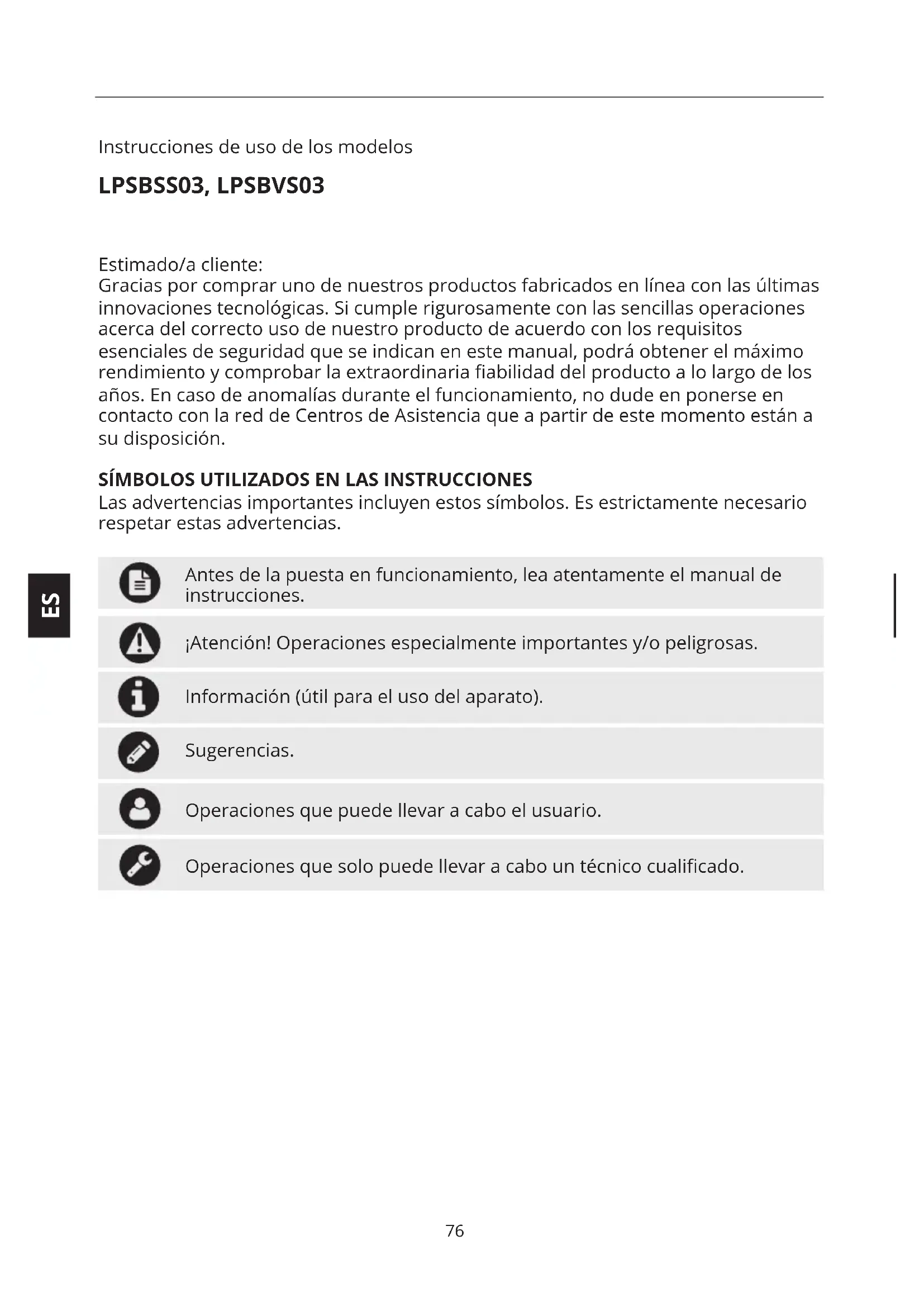 Instrucciones de uso de los modelos LPSBSS03, LPSBVS03 Estimado/a cliente: Gracias por comprar uno de nuestros productos fabricados en línea con las últimas innovaciones tecnológicas. Si cumple rigurosamente con las sencillas operaciones acerca del correcto uso de nuestro producto de acuerdo con los requisitos esenciales de seguridad que se indican en este manual, podrá obtener el máximo rendimiento y comprobar la extraordinaria abilidad del producto a lo largo de los años. En caso de anomalías durante el funcionamiento, no dude en ponerse en contacto con la red de Centros de Asistencia que a partir de este momento están a su disposición.
