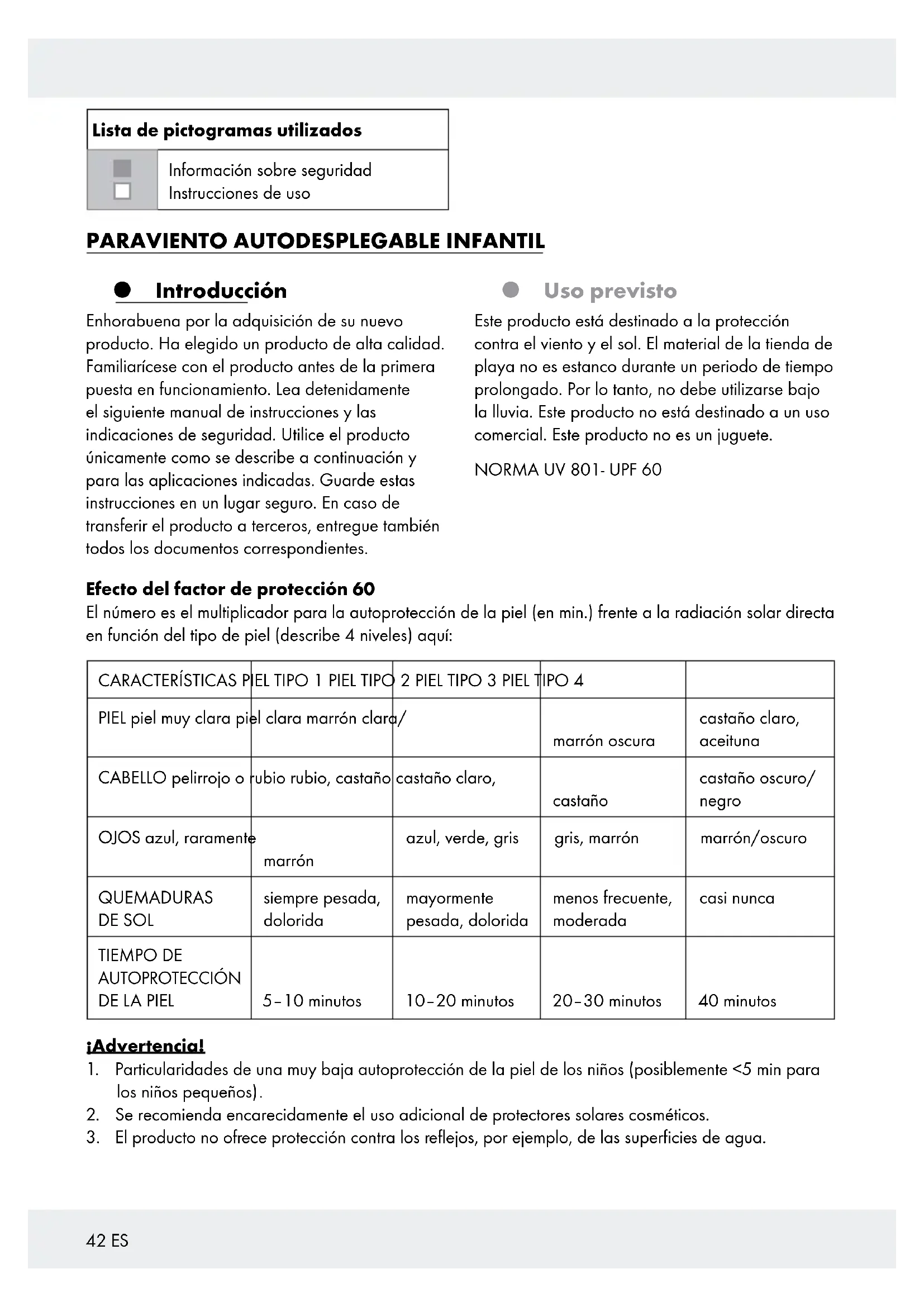Efecto del factor de protección 60 El número es el multiplicador para la autoprotección de la piel (en min.) frente a la radiación solar directa en función del tipo de piel (describe 4 niveles) aquí: CARACTERÍSTICAS PIEL TIPO 1 PIEL TIPO 2 PIEL TIPO 3 PIEL TIPO 4 PIEL piel muy clara piel clara marrón clara/ marrón oscura castaño claro, aceituna CABELLO pelirrojo o rubio rubio, castaño castaño claro, castaño castaño oscuro/ negro OJOS azul, raramente marrón azul, verde, gris gris, marrón marrón/oscuro QUEMADURAS DE SOL siempre pesada, dolorida mayormente pesada, dolorida menos frecuente, moderada casi nunca TIEMPO DE AUTOPROTECCIÓN DE LA PIEL 5–10 minutos 10–20 minutos 20–30 minutos 40 minutos ¡Advertencia!