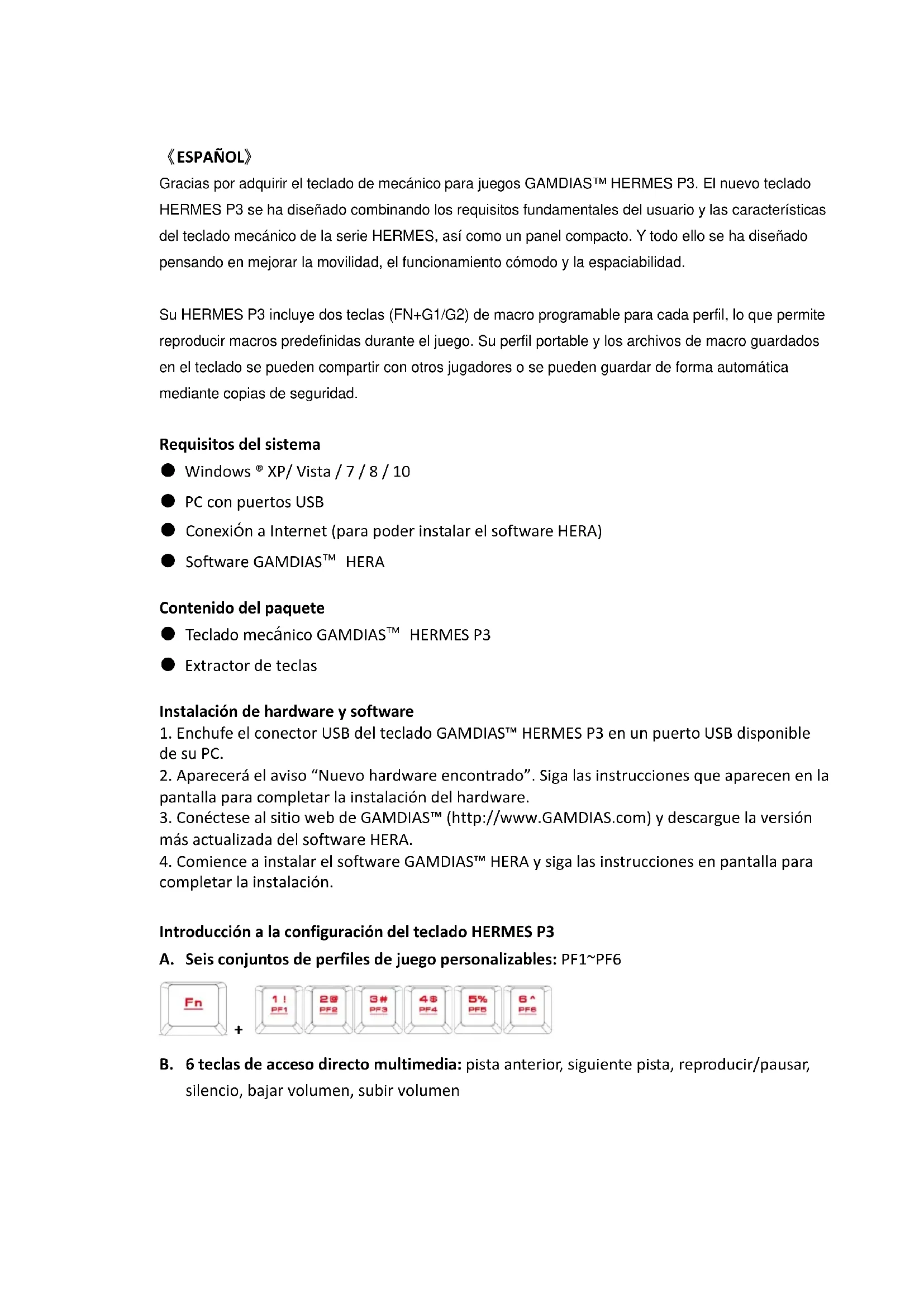 Gracias por adquirir el teclado de mecánico para juegos GAMDIAS™ HERMES P3. El nuevo teclado HERMES P3 se ha diseñado combinando los requisitos fundamentales del usuario y las características del teclado mecánico de la serie HERMES, así como un panel compacto. Y todo ello se ha diseñado pensando en mejorar la movilidad, el funcionamiento cómodo y la espaciabilidad. Su HERMES P3 incluye dos teclas (FN+G1/G2) de macro programable para cada perfil, lo que permite reproducir macros predefinidas durante el juego. Su perfil portable y los archivos de macro guardados en el teclado se pueden compartir con otros jugadores o se pueden guardar de forma automática mediante copias de seguridad. Requisitos del sistema ● Windows ® XP/ Vista / 7 / 8 / 10 ● PC con puertos USB ● Conexión a Internet (para poder instalar el software HERA) ● Software GAMDIAS™ HERA Contenido del paquete ● Teclado mecánico GAMDIAS™ HERMES P3 ● Extractor de teclas Instalación de hardware y software