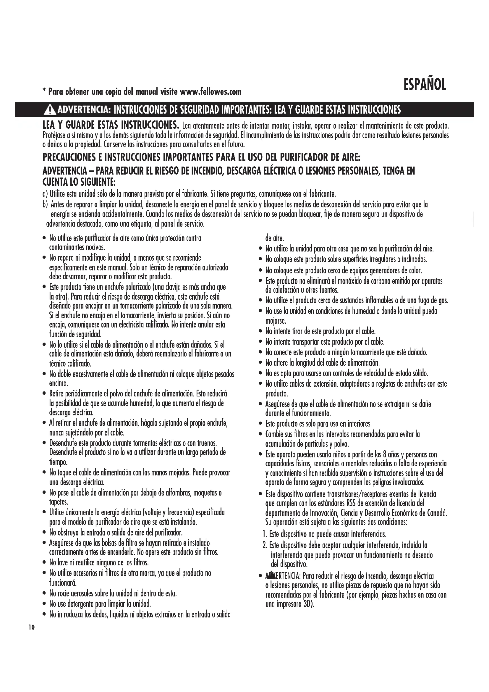 - Repita la instrucción de reinicio de la luz del filtro. Garantía limitada: Fellowes, Inc. (“Fellowes”) garantiza que el purificador de aire de grado comercial Array AS1 (“Producto”) está libre de defectos de material y mano de obra durante los períodos de tiempo que se establecen a continuación. Los contadores de partículas, IOT, sensores y pantalla de visualización durante un período de tres (3) años a partir de la fecha de compra original del Producto. Todas las demás partes por un período de cinco (5) años a partir de la fecha de compra original del Producto. En el caso de que el Producto se instale en una nueva construcción, el período de garantía comenzará en la fecha del permiso de ocupación o un año después de la fecha de compra, lo que ocurra primero. Si se determina que alguna pieza es defectuosa durante el período de garantía, Fellowes (a su exclusivo criterio) reparará o reemplazará el producto defectuoso sin cargo por el servicio o las piezas. Esta garantía no cubre los daños causados por el uso de filtros no aprobados por Fellowes o por no seguir el programa de reemplazo recomendado. Esta garantía no se aplica en los casos de abuso, mal manejo, incumplimiento de las normas de uso del producto, operación con una fuente de alimentación inadecuada (diferente a la que figura en la etiqueta), error de instalación o reparación no autorizada. Esta garantía no cubre los filtros reemplazables. Fellowes se reserva el derecho de cobrar al consumidor cualquier costo adicional incurrido por Fellowes para proporcionar piezas o servicio fuera del país donde un revendedor autorizado vendió inicialmente el Producto. En el caso de que el producto no sea fácilmente accesible para el personal de servicio designado por Fellowes, Fellowes se reserva el derecho de suministrar al cliente piezas de repuesto o productos para satisfacer plenamente sus obligaciones en virtud de esta garantía y cualquier obligación de servicio. CUALQUIER GARANTÍA IMPLÍCITA, INCLUIDA LA DE COMERCIABILIDAD O IDONEIDAD PARA UN PROPÓSITO EN PARTICULAR, SE LIMITA EN LA DURACIÓN DEL PERÍODO DE GARANTÍA APROPIADO ESTABLECIDO ANTERIORMENTE. En ningún caso, Fellowes será responsable de daños consecuentes, incidentales, indirectos o especiales. Esta garantía le otorga derechos legales específicos. La duración, los términos y las condiciones de esta garantía son válidos en todo el mundo, excepto cuando las leyes locales exijan limitaciones, restricciones o condiciones diferentes. Para obtener más detalles o para obtener servicio bajo esta garantía, comuníquese con nosotros o con su distribuidor.