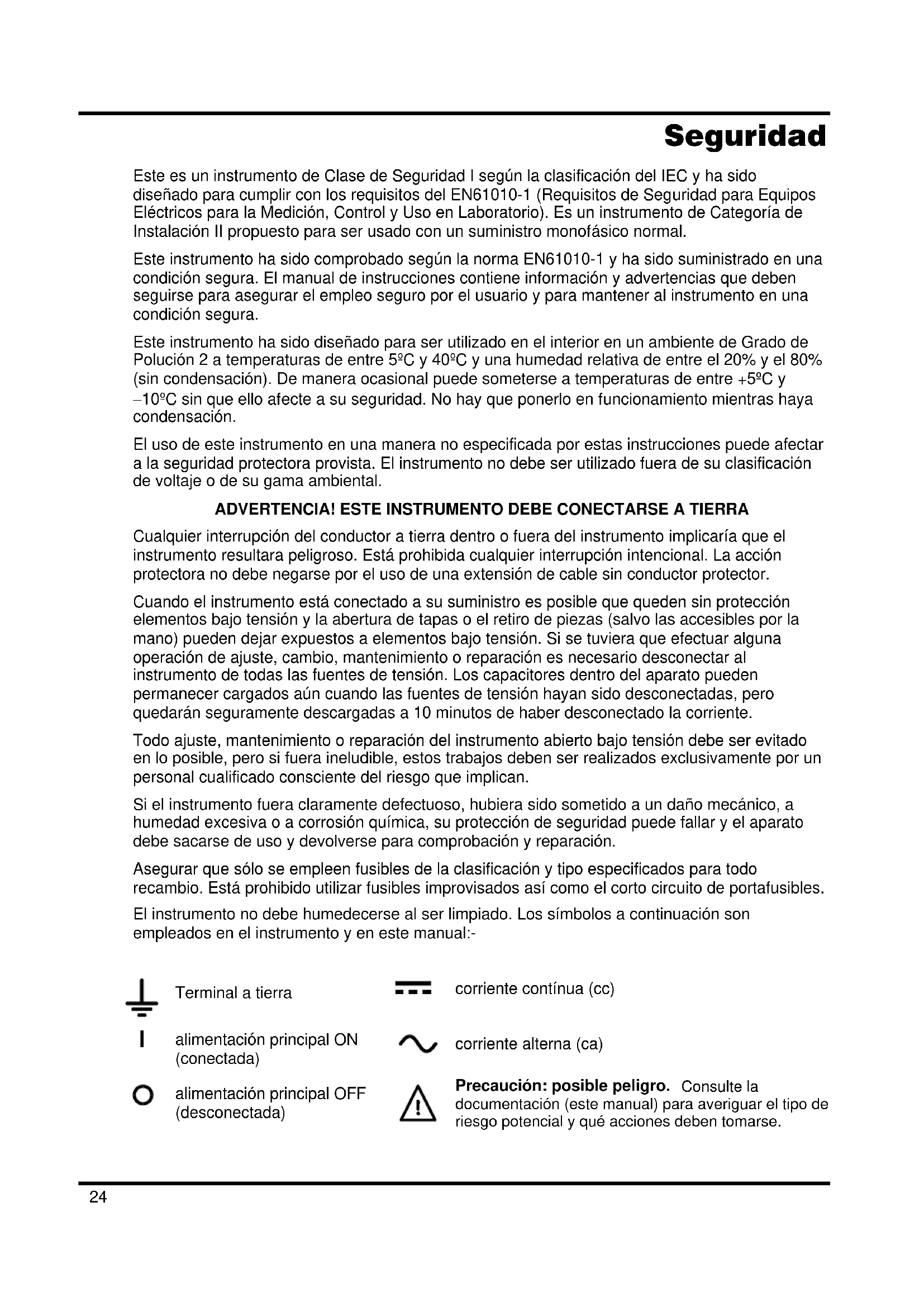 corriente alterna (ca) alimentación principal OFF (desconectada) Precaución: posible peligro. Consulte la documentación (este manual) para averiguar el tipo de riesgo potencial y qué acciones deben tomarse.25 Instalación Tensión de la Red Eléctrica Este instrumento tiene un rango de entrada universal y funcionará sin necesidad de ajustes en suministros eléctricos de 115V o 230V. Compruebe que el suministro local satisface los requisitos de entrada CA que se estipulan en Especificaciones. Cable de red Conectar el instrumento al suministro de CA usando el cable de la red incluido. Si requiere un enchufe de la red para una toma de energía diferente, deberá utilizar un conjunto de cable de la red aprobado con la capacidad adecuada provisto del enchufe de pared requerido y un conector IEC60320 C13 para el extremo del instrumento. Para determinar la capacidad mínima de corriente del conjunto del cable para el suministro de CA específico, leer las Especificaciones o la información referente a la potencia de salida del equipo. ADVERTENCIA! ESTE INSTRUMENTO DEBE CONECTARSE A TIERRA Cualquier interrupción del conductor a tierra dentro o fuera del instrumento implicaría que el instrumento resultara peligroso. Está prohibida cualquier interrupción intencional. Ventilación El suministro de fuerza es muy eficaz pero puede generar mucho calor a fuerza plena. El suministro depende de enfriamiento por convección solamente y por lo tanto es importante que la ventilación no esté restringida si se quiere mantener el rendimiento y la seguridad. Conexiones Todas las conexiones se efectuan desde el panel delantero. La carga se ha de conectar a los terminales positivo (rojo) y negativo (negro) marcados OUTPUT (Salida). Conecte a una o ambas salidas, según corresponda al modo seleccionado, ver el apartado Operación.