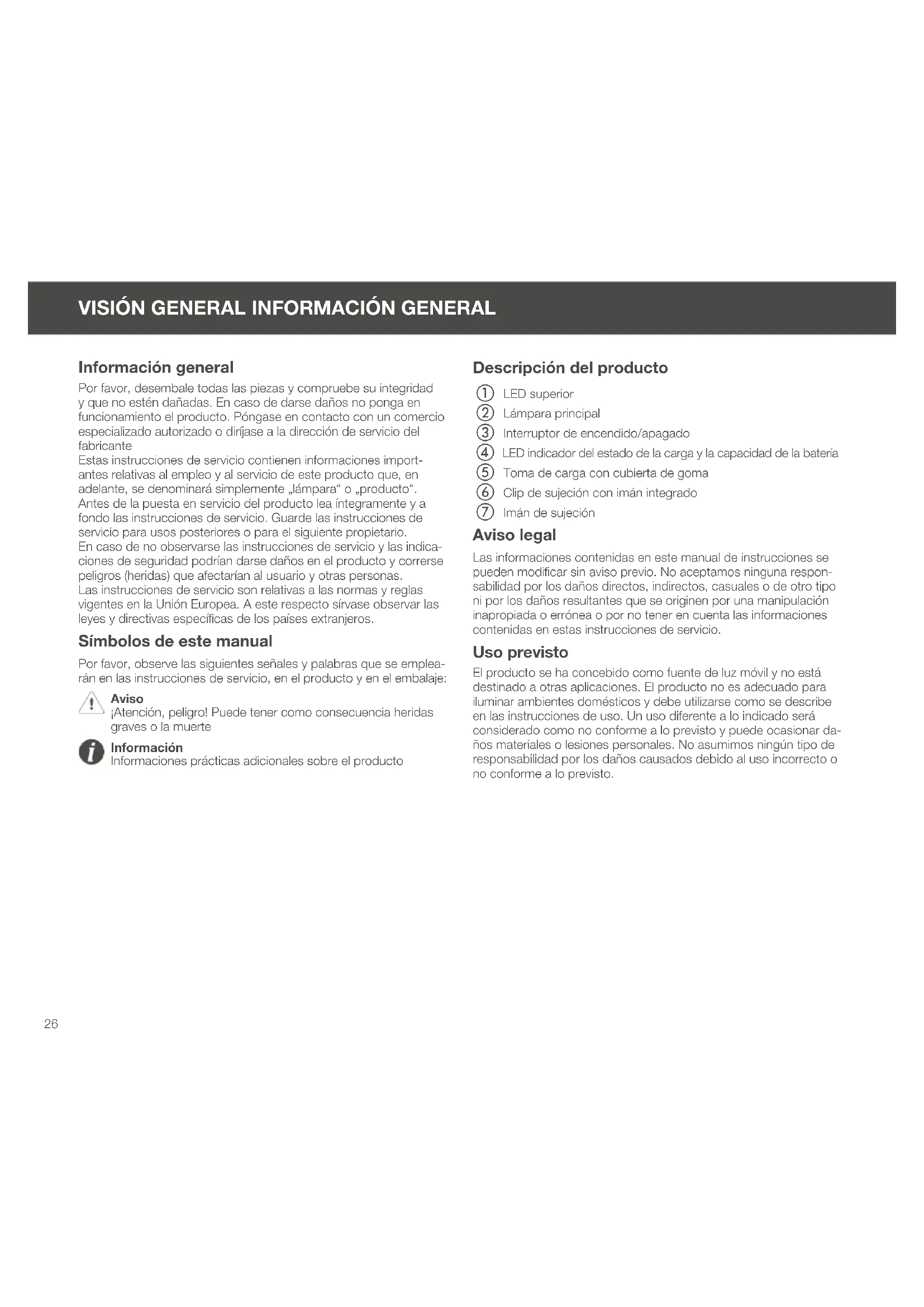 Información general Por favor, desembale todas las piezas y compruebe su integridad y que no estén dañadas. En caso de darse daños no ponga en funcionamiento el producto. Póngase en contacto con un comercio especializado autorizado o diríjase a la dirección de servicio del fabricante Estas instrucciones de servicio contienen informaciones import- antes relativas al empleo y al servicio de este producto que, en adelante, se denominará simplemente „lámpara“ o „producto“. Antes de la puesta en servicio del producto lea íntegramente y a fondo las instrucciones de servicio. Guarde las instrucciones de servicio para usos posteriores o para el siguiente propietario. En caso de no observarse las instrucciones de servicio y las indica- ciones de seguridad podrían darse daños en el producto y correrse peligros (heridas) que afectarían al usuario y otras personas. Las instrucciones de servicio son relativas a las normas y reglas vigentes en la Unión Europea. A este respecto sírvase observar las leyes y directivas especícas de los países extranjeros. Símbolos de este manual Por favor, observe las siguientes señales y palabras que se emplea- rán en las instrucciones de servicio, en el producto y en el embalaje: Aviso ¡Atención, peligro! Puede tener como consecuencia heridas graves o la muerte Información Informaciones prácticas adicionales sobre el producto Descripción del producto a.LED superior b.Lámpara principal c.Interruptor de encendido/apagado d.LED indicador del estado de la carga y la capacidad de la batería e.Toma de carga con cubierta de goma f.Clip de sujeción con imán integrado g.Imán de sujeción Aviso legal Las informaciones contenidas en este manual de instrucciones se pueden modicar sin aviso previo. No aceptamos ninguna respon- sabilidad por los daños directos, indirectos, casuales o de otro tipo ni por los daños resultantes que se originen por una manipulación inapropiada o errónea o por no tener en cuenta las informaciones contenidas en estas instrucciones de servicio. Uso previsto El producto se ha concebido como fuente de luz móvil y no está destinado a otras aplicaciones. El producto no es adecuado para iluminar ambientes domésticos y debe utilizarse como se describe en las instrucciones de uso. Un uso diferente a lo indicado será considerado como no conforme a lo previsto y puede ocasionar da- ños materiales o lesiones personales. No asumimos ningún tipo de responsabilidad por los daños causados debido al uso incorrecto o no conforme a lo previsto.ES