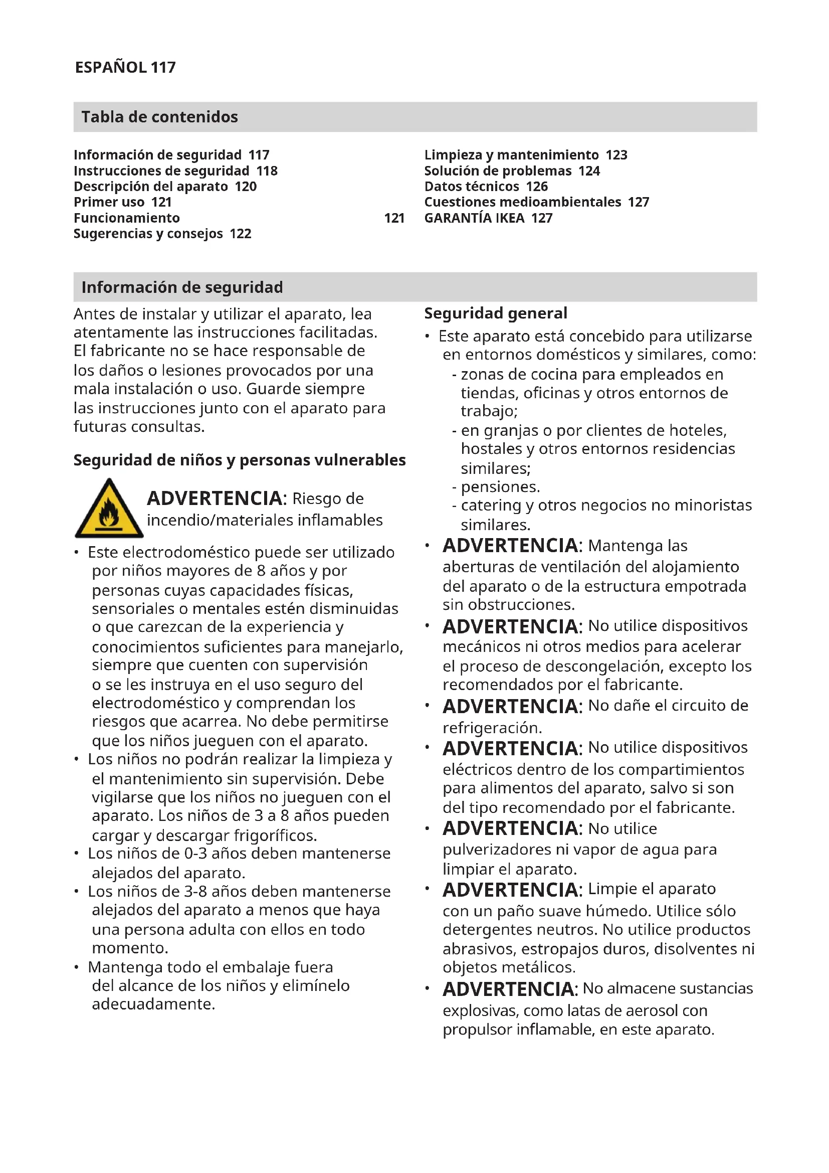 - solicitar aclaraciones sobre las funciones de los aparatos IKEA. Para asegurar de que le proporcionaremos la mejor asistencia, por favor, lea atentamente las Instrucciones de Montaje y/o el Manual de Instrucciones antes de contactar con nosotros.ESPAÑOL 129 ¿Cómo contactar con nosotros si necesita nuestro servicio? Puede encontrar los números de teléfono de los proveedores de servicios posventa designados por IKEA al nal de este manual. Para ofrecerle un servicio más rápido, le recomendamos que utilice los números de teléfono especícos que se encuentran en este manual. Utilice siempre los números de teléfono que guran en el manual del usuario en particular para el que necesita ayuda. Recuerde proporcionar el número de artículo de 8 dígitos y el número de serie de 22 dígitos que se indican en la placa de características del aparato. ¡GUARDE LA FACTURA O EL RECIBO DE COMPRA! Es la prueba de la compra y la necesitará para hacer uso de la garantía. El recibo también incluye el nombre y el número del producto (8 dígitos) de IKEA, para cada uno de los electrodomésticos que compre. ¿Necesita ayuda adicional? Para todas las cuestiones adicionales no relacionadas con el Centro de servicio autorizado sobre sus aparatos, por favor, diríjase a la central telefónica de la tienda IKEA más cercana. Le recomendamos que lea atentamente la documentación del aparato antes de contactar con nosotros. Información sobre piezas de repuesto - Las siguientes piezas de repuestos: termostatos, sensores de temperatura, placas de circuito impreso y fuentes de luz, estarán disponibles para reparadores profesionales durante un período mínimo de siete años, después de que se ponga a la venta la última unidad del modelo. - Las siguientes piezas de repuestos: manijas de puertas, bisagras de puertas, bandejas y cestas estarán disponibles para reparadores profesionales y usuarios nales durante un período mínimo de siete años, y las juntas de las puertas durante un período mínimo de 10 años, después de que se ponga a la venta la última unidad del modelo. Puede encontrar las piezas de repuesto en: www.ikea.comΕΛΛΗΝΙΚΑ 130 Πίνακας περιεχομένων Πληροφορίες ασφαλείας Πριν από την εγκατάσταση και τη χρήση της συσκευής, διαβάστε προσεκτικά τις παρεχόμενες οδηγίες. Ο κατασκευαστής δεν ευθύνεται αν προκληθεί τραυματισμός ή ζημιά από λανθασμένη εγκατάσταση ή χρήση. Να φυλάσσετε πάντα τις παρούσες οδηγίες μαζί με τη συσκευή για μελλοντική