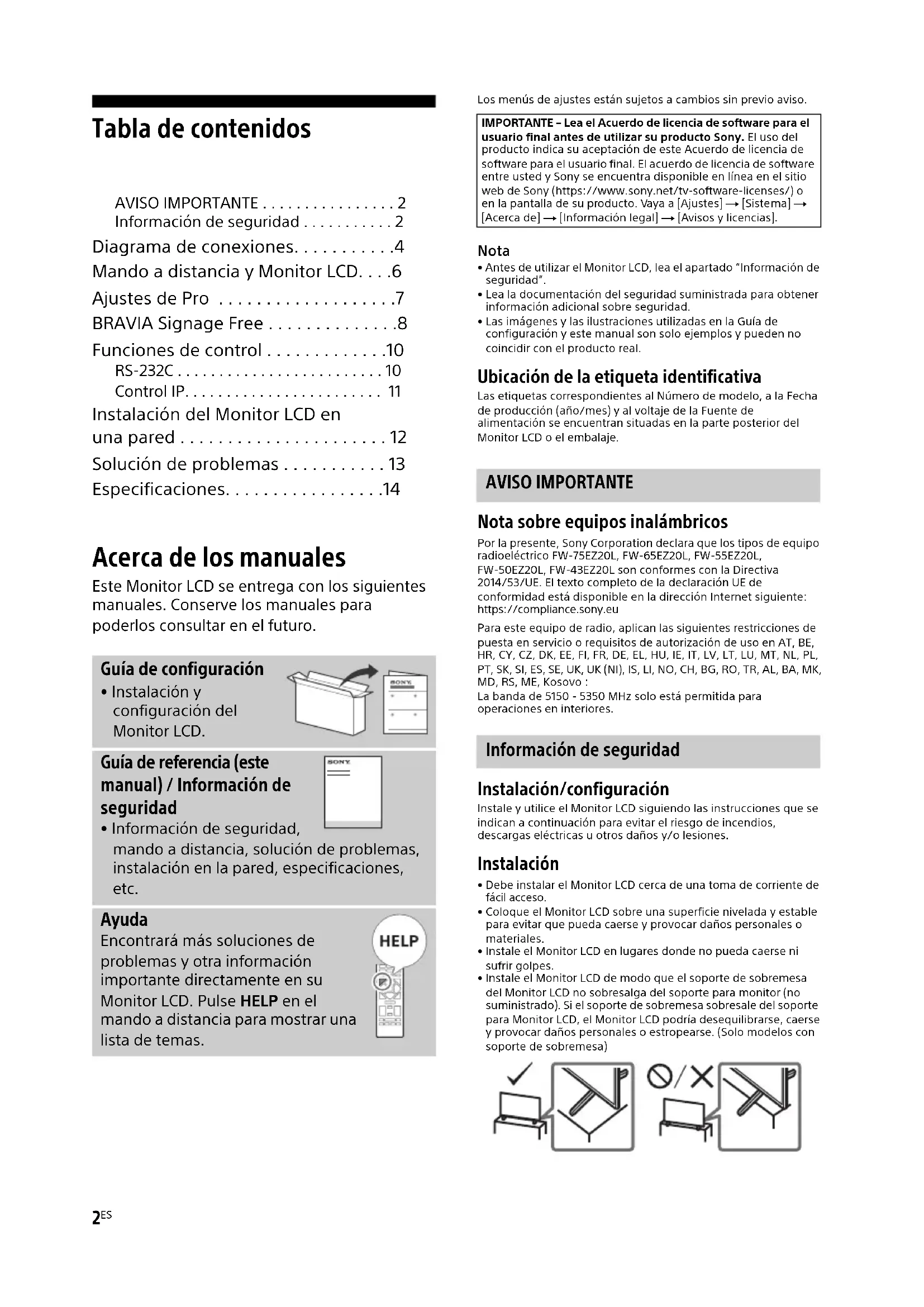- Antes de utilizar el Monitor LCD, lea el apartado “Información de seguridad”.• Lea la documentación del seguridad suministrada para obtener información adicional sobre seguridad.• Las imágenes y las ilustraciones utilizadas en la Guía de configuración y este manual son solo ejemplos y pueden no coincidir con el producto real. Ubicación de la etiqueta identificativa Las etiquetas correspondientes al Número de modelo, a la Fecha de producción (año/mes) y al voltaje de la Fuente de alimentación se encuentran situadas en la parte posterior del Monitor LCD o el embalaje. Nota sobre equipos inalámbricos Por la presente, Sony Corporation declara que los tipos de equipo radioeléctrico FW-75EZ20L, FW-65EZ20L, FW-55EZ20L, FW-50EZ20L, FW-43EZ20L son conformes con la Directiva 2014/53/UE. El texto completo de la declaración UE de conformidad está disponible en la dirección Internet siguiente: https://compliance.sony.euPara este equipo de radio, aplican las siguientes restricciones de puesta en servicio o requisitos de autorización de uso en AT, BE, HR, CY, CZ, DK, EE, FI, FR, DE, EL, HU, IE, IT, LV, LT, LU, MT, NL, PL, PT, SK, SI, ES, SE, UK, UK (NI), IS, LI, NO, CH, BG, RO, TR, AL, BA, MK, MD, RS, ME, Kosovo :La banda de 5150 - 5350 MHz solo está permitida para operaciones en interiores. Instalación/configuración Instale y utilice el Monitor LCD siguiendo las instrucciones que se indican a continuación para evitar el riesgo de incendios, descargas eléctricas u otros daños y/o lesiones. Instalación