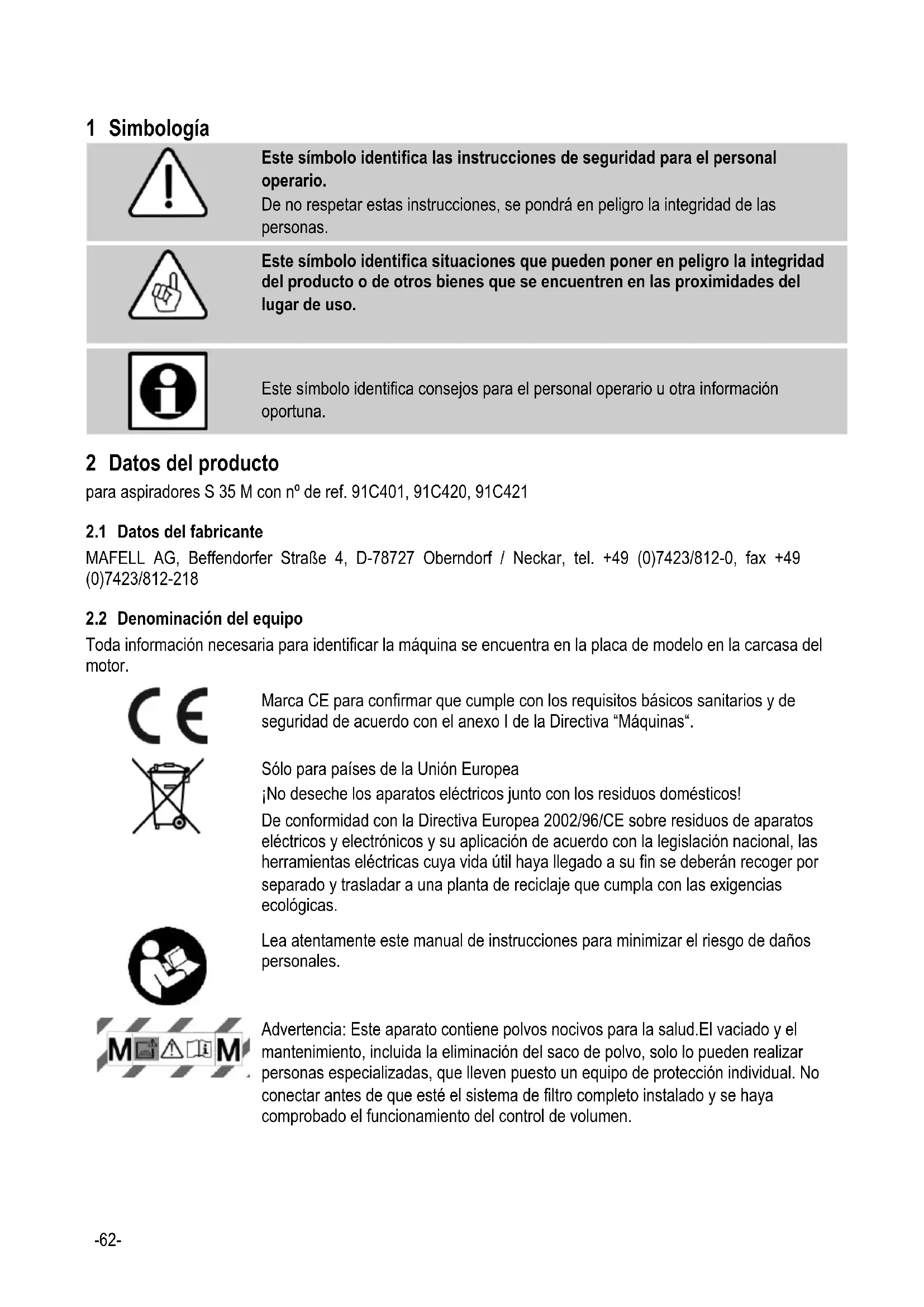 Las aspiradoras de la clase M son aptas para aspirar/absorber polvos secos, no combustibles, líquidos no combustibles, polvos de madera y polvos peligrosos con un límite en puesto de trabajo >0,1mg/m³. Cualquier otro uso de la máquina se considera inapropiado. No se podrá presentar reclamación alguna ante el fabricante por los daños que se desprendan del uso inapropiado. El uso proyectado comprende respetar todas las instrucciones relativas al uso, el mantenimiento y la reparación del fabricante. Este aparato no se debe utilizar al aire libre en caso de que llueva ni en locales en potencia de explosión. El dispositivo de aspiración S 35 M solo puede ser utilizado, reequipado y mantenido por personas que estén familiarizadas con los peligros. Los trabajos de reparación solo pueden ser realizados por distribuidores autorizados de MAFELL o puntos de asistencia técnica de MAFELL. Respete las normas de seguridad vigentes en el país correspondiente y demás normas de seguridad e higiene laboral establecidas.