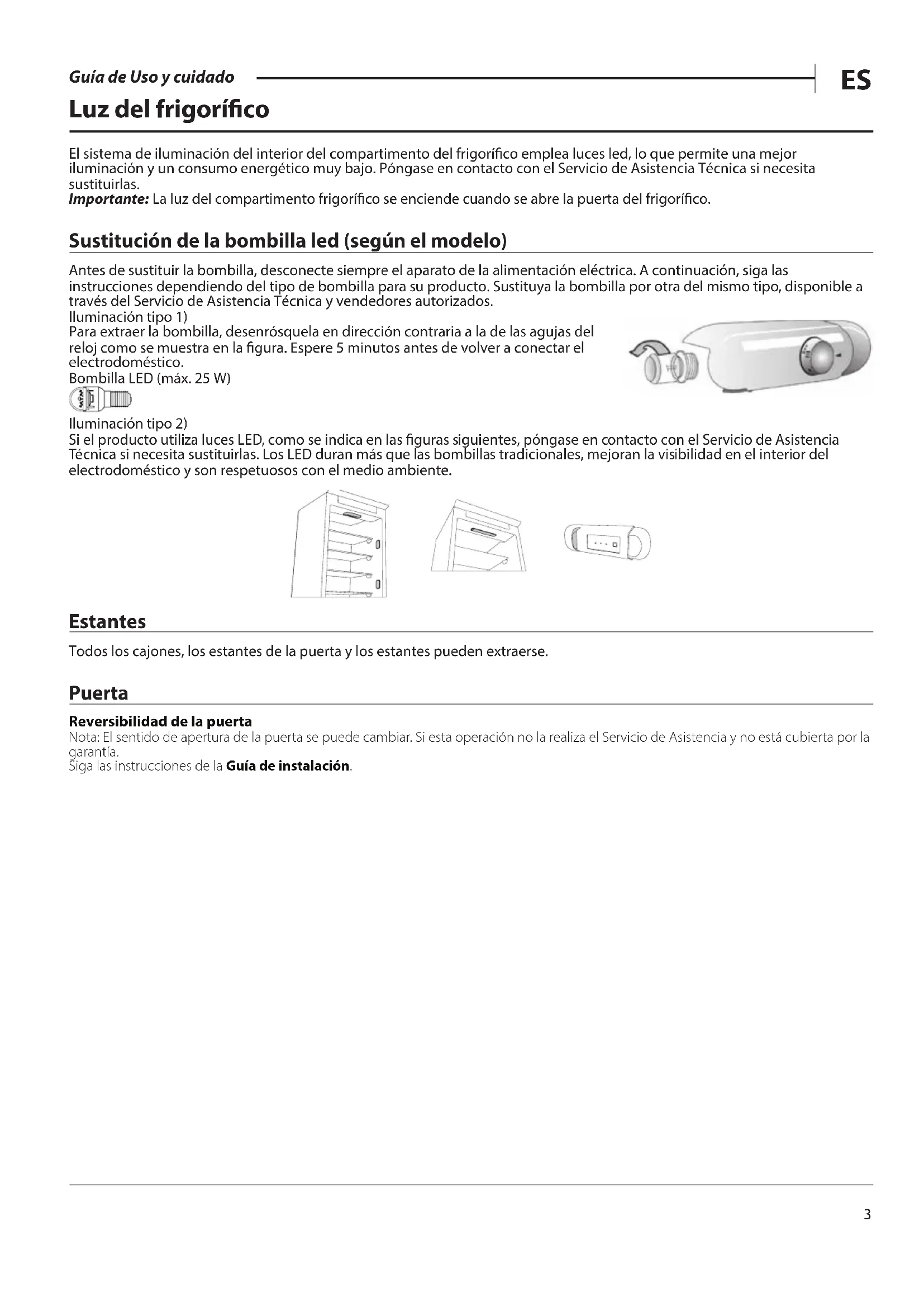 Guía de Uso y cuidado Luz del frigoríco El sistema de iluminación del interior del compartimento del frigoríco emplea luces led, lo que permite una mejor iluminación y un consumo energético muy bajo. Póngase en contacto con el Servicio de Asistencia Técnica si necesita sustituirlas. Importante: La luz del compartimento frigoríco se enciende cuando se abre la puerta del frigoríco. Sustitución de la bombilla led (según el modelo) Antes de sustituir la bombilla, desconecte siempre el aparato de la alimentación eléctrica. A continuación, siga las instrucciones dependiendo del tipo de bombilla para su producto. Sustituya la bombilla por otra del mismo tipo, disponible a través del Servicio de Asistencia Técnica y vendedores autorizados. Iluminación tipo 1) Para extraer la bombilla, desenrósquela en dirección contraria a la de las agujas del reloj como se muestra en la gura. Espere 5 minutos antes de volver a conectar el electrodoméstico. Bombilla LED (máx. 25W) Iluminación tipo 2) Si el producto utiliza luces LED, como se indica en las guras siguientes, póngase en contacto con el Servicio de Asistencia Técnica si necesita sustituirlas. Los LED duran más que las bombillas tradicionales, mejoran la visibilidad en el interior del electrodoméstico y son respetuosos con el medio ambiente. Estantes Todos los cajones, los estantes de la puerta y los estantes pueden extraerse. Puerta Reversibilidad de la puerta Nota: El sentido de apertura de la puerta se puede cambiar. Si esta operación no la realiza el Servicio de Asistencia y no está cubierta por la garantía.Siga las instrucciones de la Guía de instalación.4 Guía de Uso y cuidado Cómo usar el aparato Primer uso Espere como mínimo dos horas tras la instalación para conectar el aparato al suministro eléctrico. El aparato se pondrá en marcha automáticamente al conectarlo al suministro eléctrico. Las temperaturas ideales para almacenar alimentos se pre- establecen en fábrica. Después de activar el aparato, es necesario esperar 4-6 horas para que pueda alcanzarse la temperatura de conservación correcta para un aparato con carga normal. Coloque el ltro antiolor y antibacterias en el ventilador como se indica en el envase del ltro (si está disponible). Si suena una señal acústica, signica que se ha activado la alarma de temperatura: pulse el botón para apagar las alarmas acústicas. Compartimento del frigoríco y conservación de alimentos El compartimento frigoríco permite conservar alimentos frescos y bebidas. La descongelación del compartimento frigoríco es totalmente automática. La presencia ocasional de gotas de agua en la pared posterior interna del compartimento indica que se está produciendo la fase de descongelación automática. El agua de descongelación pasa a un oricio de desagüe y después a un recipiente, donde se evapora. Nota: la temperatura ambiente, la frecuencia con la que se abran las puertas y la ubicación del aparato pueden afectar a las temperaturas internas de los dos compartimentos. Programe las temperaturas teniendo en cuenta estos factores. En condiciones muy húmedas se puede formar condensación en el compartimento frigoríco, especialmente en los estantes de cristal. En este caso, se recomienda cerrar los recipientes que contengan líquidos (p. ej. ollas con caldo), envolver los alimentos con alto contenido en humedad (p. ej. verduras) y conectar el ventilador, si está disponible. Todos los cajones, los estantes de la puerta y los estantes pueden extraerse. Ventilación de aire El aire de la ventilación permite una mejor distribución de las temperaturas en el interior de los compartimentos y, por tanto, conservar mejor los alimentos y reducir el exceso de humedad. No obstruya la zona de ventilación. Cómo almacenar alimentos frescos y bebidas Los alimentos que desprenden mucho gas etileno (manzanas, albaricoques, peras, melocotones, aguacates, higos, ciruelas, arándanos, melones o judías) y aquellos que son sensibles a este gas, como las frutas y verduras o la lechuga, deben conservarse siempre en compartimentos separados o envolverse para no reducir su tiempo de conservación; Por ejemplo, no debe conservar los tomates junto con los kiwis o la col. No coloque los alimentos muy juntos para permitir una adecuada circulación de aire. Utilice recipientes reciclables de plástico, metal, aluminio y cristal o lm transparente para envolver los alimentos. Si tiene que almacenar poca cantidad de alimentos en el frigoríco, recomendamos utilizar los estantes de encima del cajón para frutas y verduras ya que es la parte del compartimento mejor refrigerada. Utilice siempre contenedores con tapa para líquidos y alimentos que puedan desprender o tomar olor o sabor de otros alimentos o cúbralos. Para evitar que se vuelquen las botellas, puede utilizar soporte para botellas (disponibles en algunos modelos).