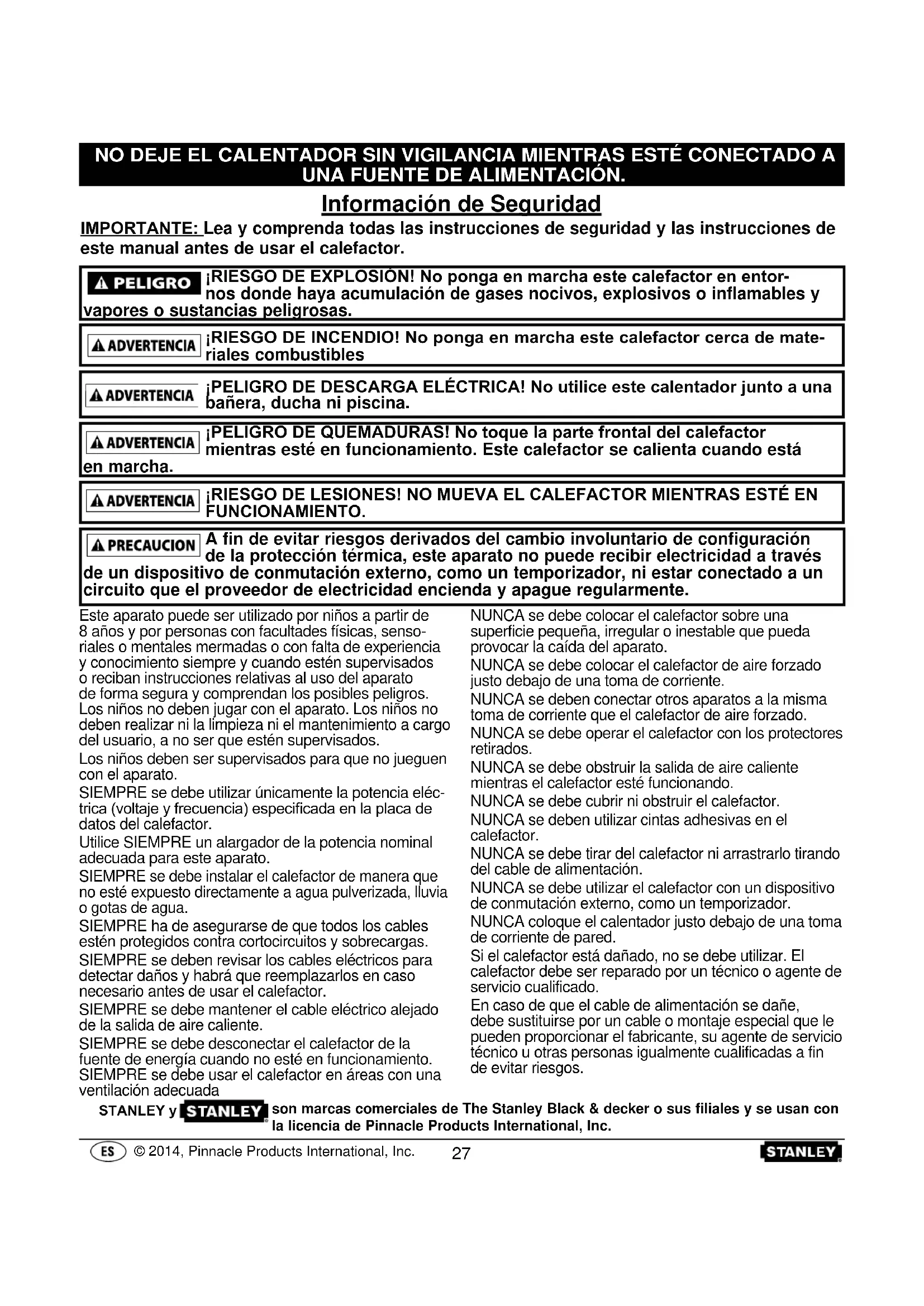 datos del calefactor. Utilice SIEMPRE un alargador de la potencia nominal adecuada para este aparato. SIEMPRE se debe instalar el calefactor de manera que no esté expuesto directamente a agua pulverizada, lluvia o gotas de agua. SIEMPRE ha de asegurarse de que todos los cables estén protegidos contra cortocircuitos y sobrecargas. SIEMPRE se deben revisar los cables eléctricos para detectar daños y habrá que reemplazarlos en caso necesario antes de usar el calefactor. SIEMPRE se debe mantener el cable eléctrico alejado de la salida de aire caliente. SIEMPRE se debe desconectar el calefactor de la fuente de energía cuando no esté en funcionamiento. SIEMPRE se debe usar el calefactor en áreas con una ventilación adecuada NUNCA se debe colocar el calefactor sobre una superficie pequeña, irregular o inestable que pueda provocar la caída del aparato. NUNCA se debe colocar el calefactor de aire forzado justo debajo de una toma de corriente. NUNCA se deben conectar otros aparatos a la misma toma de corriente que el calefactor de aire forzado. NUNCA se debe operar el calefactor con los protectores retirados. NUNCA se debe obstruir la salida de aire caliente mientras el calefactor esté funcionando. NUNCA se debe cubrir ni obstruir el calefactor. NUNCA se deben utilizar cintas adhesivas en el calefactor. NUNCA se debe tirar del calefactor ni arrastrarlo tirando del cable de alimentación. NUNCA se debe utilizar el calefactor con un dispositivo de conmutación externo, como un temporizador. NUNCA coloque el calentador justo debajo de una toma de corriente de pared. Si el calefactor está dañado, no se debe utilizar. El calefactor debe ser reparado por un técnico o agente de servicio cualificado. En caso de que el cable de alimentación se dañe, debe sustituirse por un cable o montaje especial que le pueden proporcionar el fabricante, su agente de servicio técnico u otras personas igualmente cualificadas a fin de evitar riesgos. A fin de evitar riesgos derivados del cambio involuntario de configuración de la protección térmica, este aparato no puede recibir electricidad a través de un dispositivo de conmutación externo, como un temporizador, ni estar conectado a un circuito que el proveedor de electricidad encienda y apague regularmente. son marcas comerciales de The Stanley Black & decker o sus filiales y se usan con la licencia de Pinnacle Products International, Inc. 67$1/(<\ 27© 2014, Pinnacle Products International, Inc. NO DEJE EL CALENTADOR SIN VIGILANCIA MIENTRAS ESTÉ CONECTADO A UNA FUENTE DE ALIMENTACIÓN.