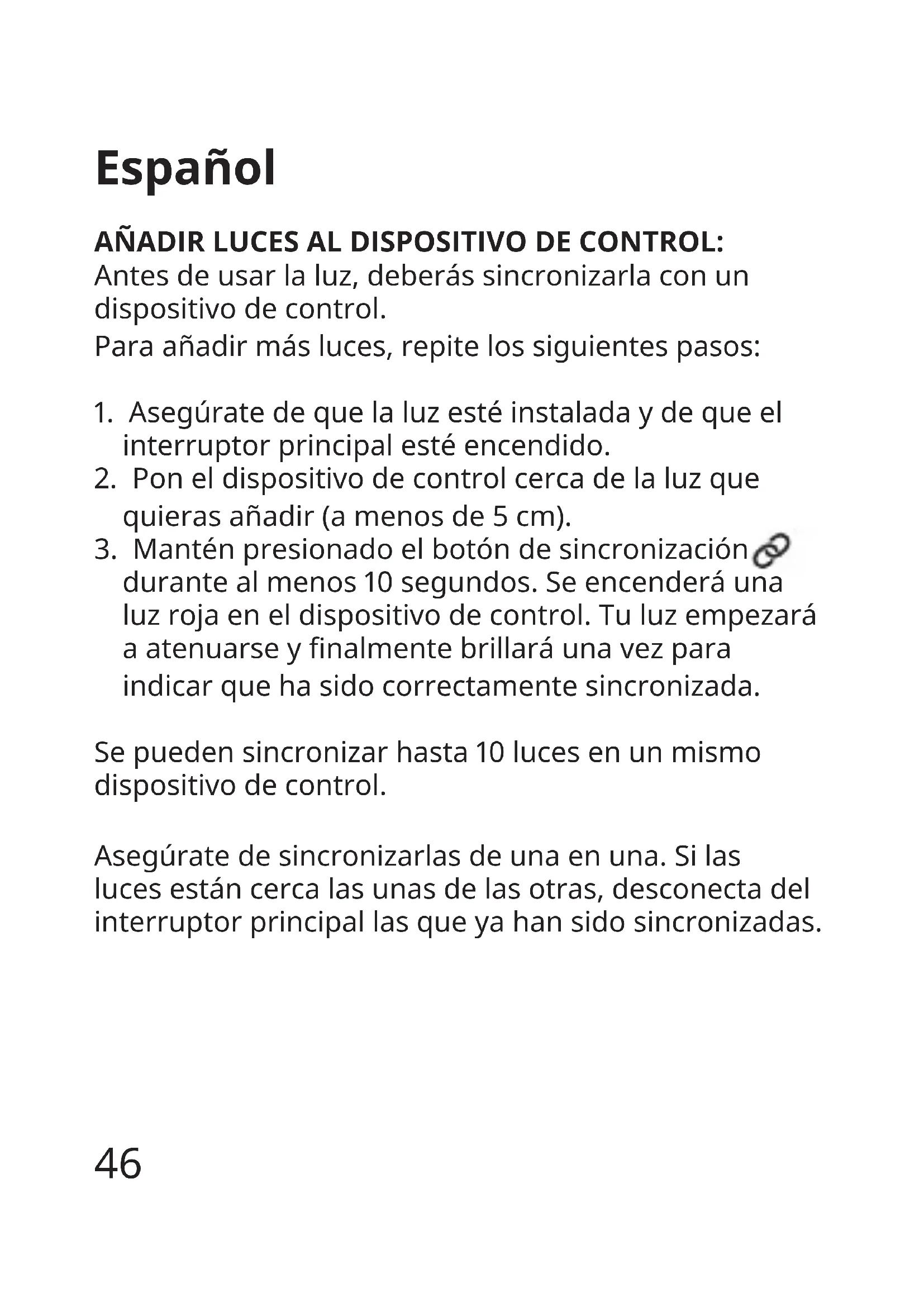 durante al menos 10 segundos. Se encenderá una luz roja en el dispositivo de control. Tu luz empezará a atenuarse y nalmente brillará una vez para indicar que ha sido correctamente sincronizada. Se pueden sincronizar hasta 10 luces en un mismo dispositivo de control. Asegúrate de sincronizarlas de una en una. Si las luces están cerca las unas de las otras, desconecta del interruptor principal las que ya han sido sincronizadas.47 ATENCIÓN: