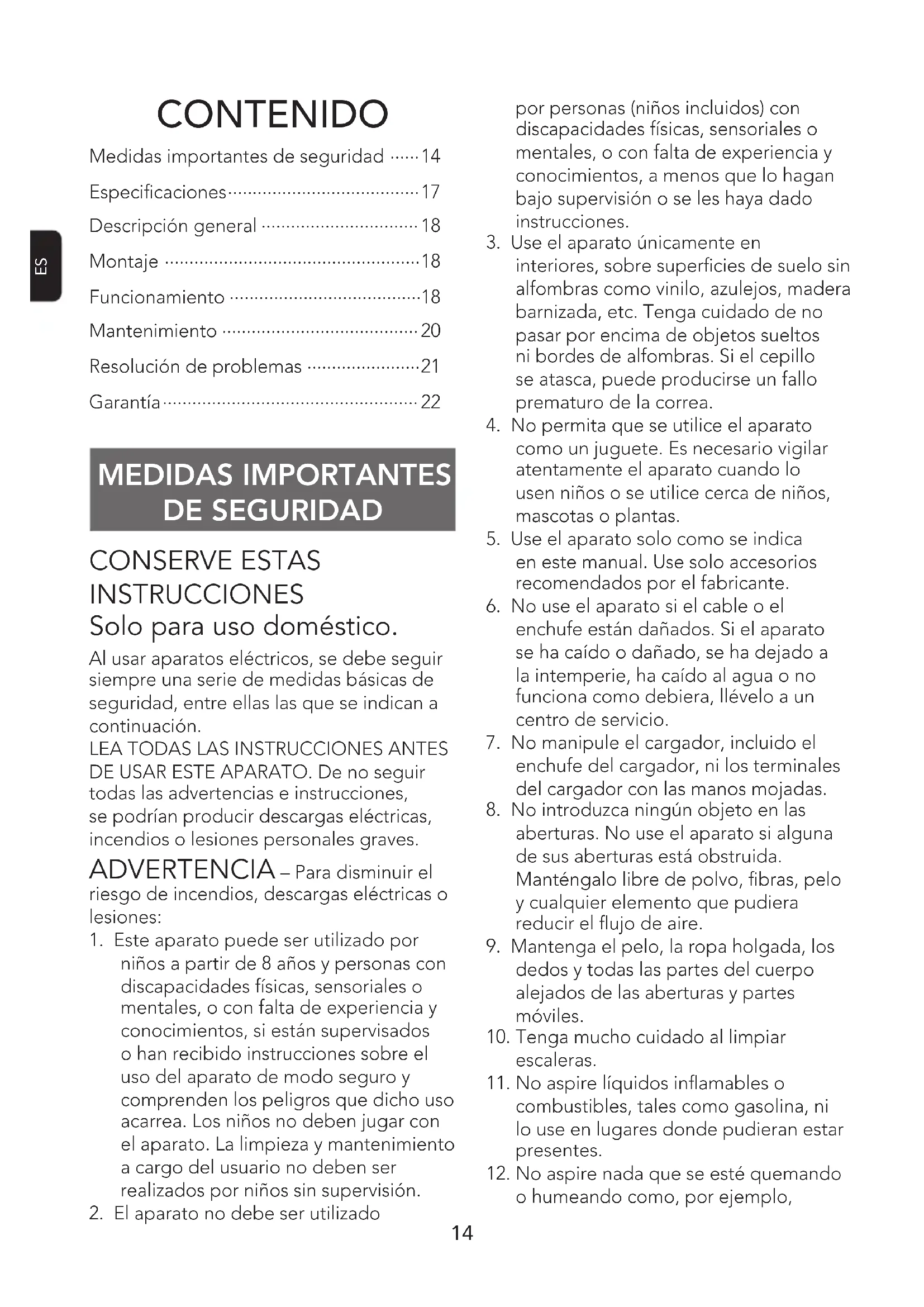 MEDIDAS IMPORTANTES DE SEGURIDAD CONSERVE ESTAS INSTRUCCIONES Solo para uso doméstico. Al usar aparatos eléctricos, se debe seguir siempre una serie de medidas básicas de seguridad, entre ellas las que se indican a continuación.