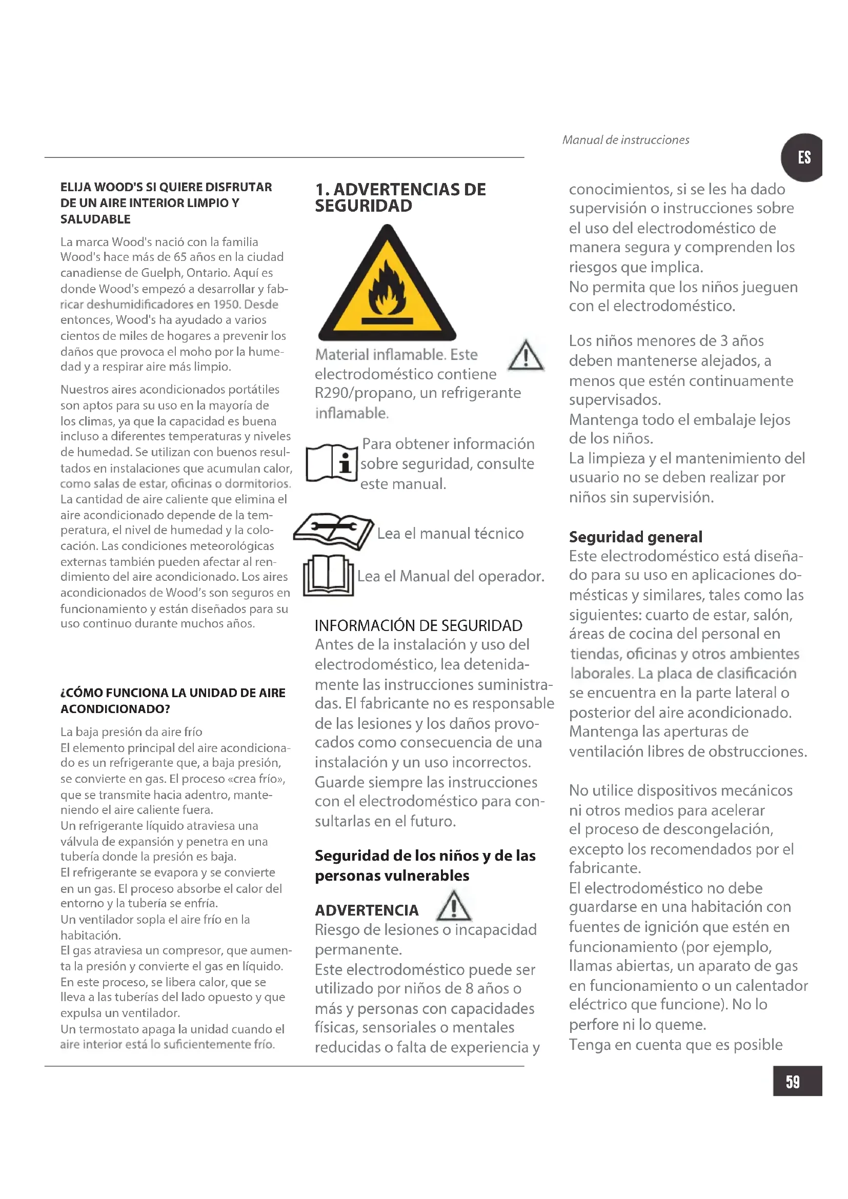 SEGURIDAD electrodoméstico contiene R290/propano, un refrigerante Para obtener información sobre seguridad, consulte este manual. Lea el manual técnico Lea el Manual del operador.