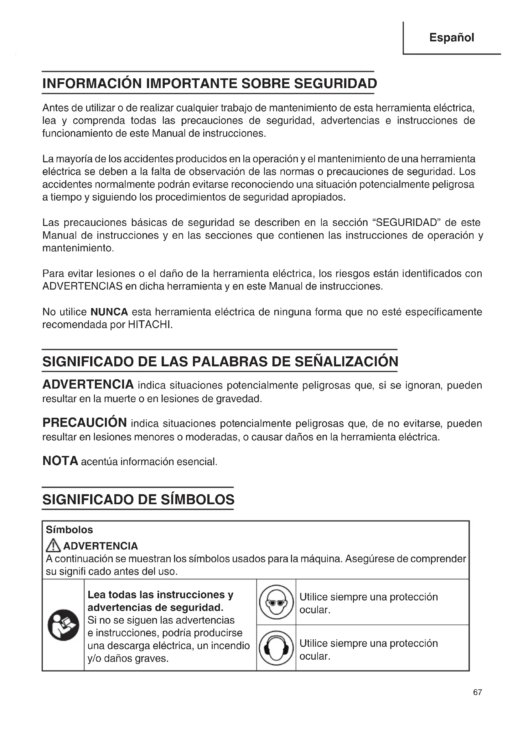 Antes de utilizar o de realizar cualquier trabajo de mantenimiento de esta herramienta eléctrica, lea y comprenda todas las precauciones de seguridad, advertencias e instrucciones de funcionamiento de este Manual de instrucciones. La mayoría de los accidentes producidos en la operación y el mantenimiento de una herramienta eléctrica se deben a la falta de observación de las normas o precauciones de seguridad. Los accidentes normalmente podrán evitarse reconociendo una situación potencialmente peligrosa a tiempo y siguiendo los procedimientos de seguridad apropiados. Las precauciones básicas de seguridad se describen en la sección “SEGURIDAD” de este Manual de instrucciones y en las secciones que contienen las instrucciones de operación y mantenimiento. Para evitar lesiones o el daño de la herramienta eléctrica, los riesgos están identifi cados con ADVERTENCIAS en dicha herramienta y en este Manual de instrucciones. No utilice NUNCA esta herramienta eléctrica de ninguna forma que no esté específi camente recomendada por HITACHI. SIGNIFICADO DE LAS PALABRAS DE SEÑALIZACIÓN ADVERTENCIA indica situaciones potencialmente peligrosas que, si se ignoran, pueden resultar en la muerte o en lesiones de gravedad. PRECAUCIÓN indica situaciones potencialmente peligrosas que, de no evitarse, pueden resultar en lesiones menores o moderadas, o causar daños en la herramienta eléctrica. NOTA acentúa información esencial.