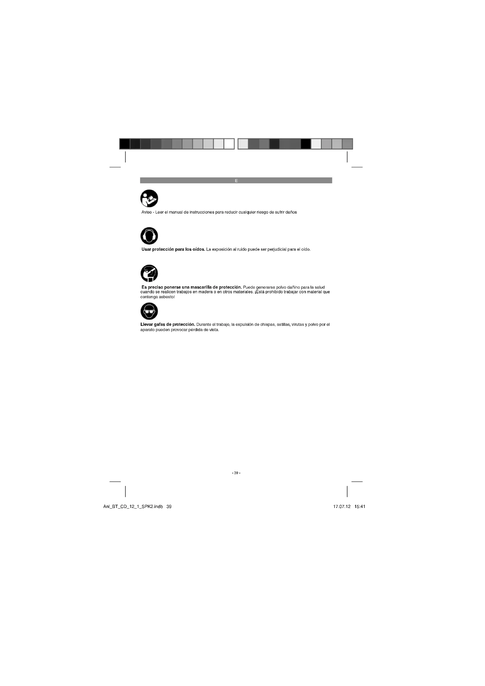 Aviso - Leer el manual de instrucciones para reducir cualquier riesgo de sufrir daños Usar protección para los oídos. La exposición al ruido puede ser perjudicial para el oído. Llevar gafas de protección. Durante el trabajo, la expulsión de chispas, astillas, virutas y polvo por el aparato pueden provocar pérdida de vista. Es preciso ponerse una mascarilla de protección. Puede generarse polvo dañino para la salud cuando se realicen trabajos en madera o en otros materiales. ¡Está prohibido trabajar con material que contenga asbesto! Anl_BT_CD_12_1_SPK2.indb 39Anl_BT_CD_12_1_SPK2.indb 39 17.07.12 15:4117.07.12 15:41E