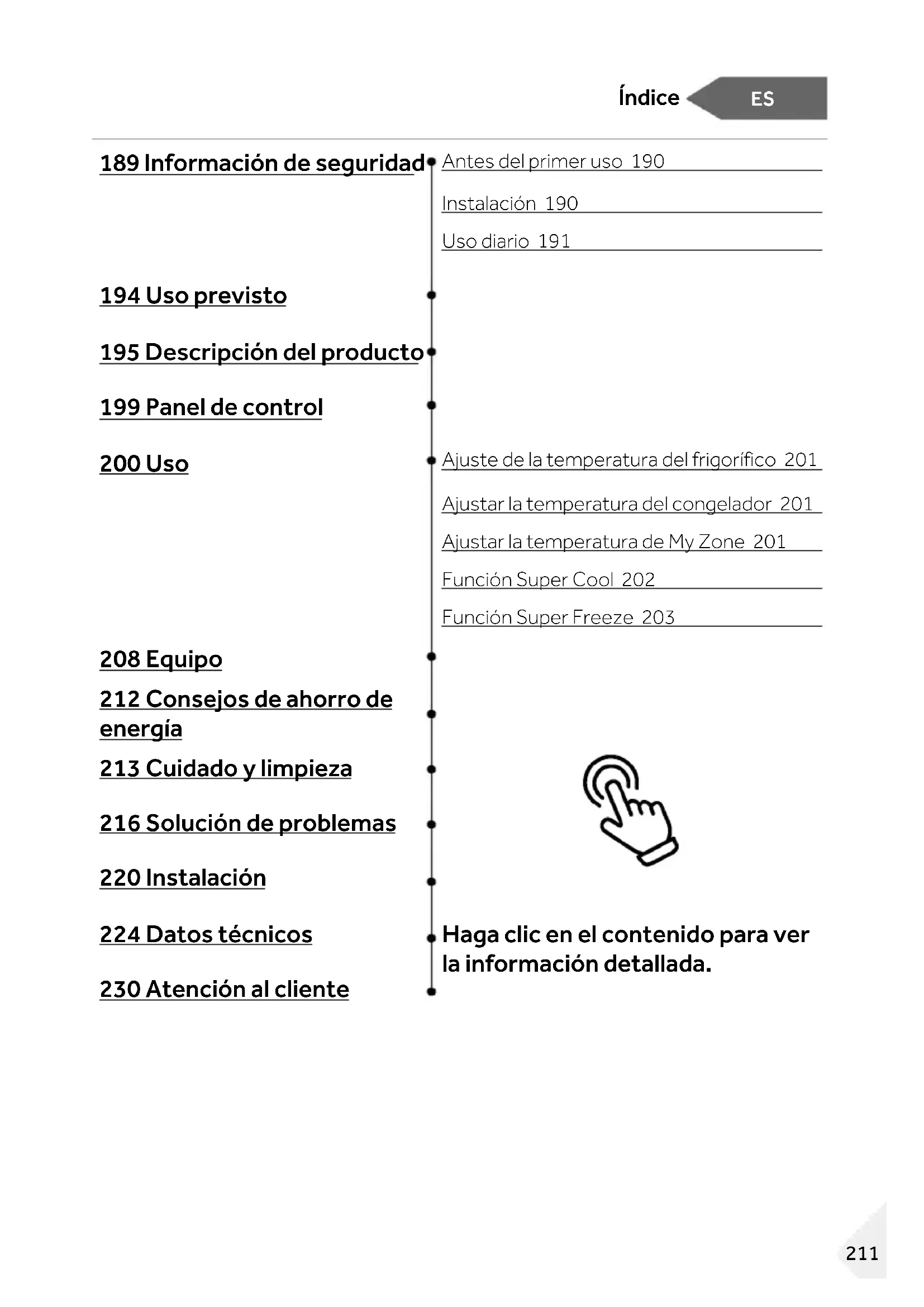 - Για άλλες χώρες, ανατρέξτε στη διεύθυνση www.haier.com Haier Europe Trading S.r.l Υποκατάστημα Ηνωμένο Βασίλειο Westgate House, Westgate, Ealing Λονδίνο, W5 1YY *Διάρκεια εγγύησης της ψυκτικής συσκευής: Η ελάχιστη εγγύηση είναι: 2 χρόνια για τις χώρες της ΕΕ, 3 χρόνια για την Τουρκία, 1 χρόνο για το Ηνωμένο Βασίλειο, 1 χρόνο για τη Ρωσία, 3 χρόνια για τη Σουηδία, 2 χρόνια για τη Σερβία, 5 χρόνια για τη Νορβηγία, 1 χρόνο για το Μαρόκο, 6 μήνες για την Αλγερία, για την Τυνησία δεν απαιτείται νομική εγγύηση. *Περίοδος διάθεσης ανταλλακτικών για επισκευή της συσκευής: Θερμοστάτες, αισθητήρες θερμοκρασίας, πλακέτες τυπωμένων κυκλωμάτων και πηγές φωτός διατίθενται για επτά τουλάχιστον χρόνια μετά τη διάθεση της τελευταίας μονάδας του μοντέλου στην αγορά. Λαβές πόρτας, μεντεσέδες πόρτας, δίσκοι και καλάθια διατίθενται για περίοδο τουλάχιστον επτά ετών και λάστιχα πόρτας για περίοδο τουλάχιστον 10 ετών μετά τη διάθεση της τελευταίας μονάδας του μοντέλου στην αγορά. *Για περισσότερες πληροφορίες σχετικά με το προϊόν, συμβουλευτείτε τη διεύθυνση https://eprel.ec.europe.eu/ ή σαρώστε τον κωδικό QR στην ενεργειακή ετικέτα που παρέχεται με τη συσκευή. 2092023 Έκδοση ΑES Índice 189 Información de seguridad Antes del primer uso 190 Instalación 190 Uso diario 191 194 Uso previsto 195 Descripción del producto 199 Panel de control 200 Uso Ajuste de la temperatura del frigorífico 201 Ajustar la temperatura del congelador 201 Ajustar la temperatura de My Zone 201 Función Super Cool 202 Función Super Freeze 203 208 Equipo 212 Consejos de ahorro de energía 213 Cuidado y limpieza 216 Solución de problemas 220 Instalación 224 Datos técnicos Haga clic en el contenido para ver la información detallada. 230 Atención al cliente 211ES Gracias Gracias por comprar un producto Haier. Lea atentamente estas instrucciones antes de utilizar este electrodoméstico. Estas instrucciones contienen información importante que le ayudará a sacar el máximo provecho del electrodoméstico y a garantizar una instalación, uso y mantenimiento seguros y adecuados. Guarde este manual en un lugar seguro para poder consultarlo en cualquier momento y garantizar un uso seguro y adecuado del electrodoméstico. Si vende este electrodoméstico, lo dona o lo deja al mudarse, asegúrese de entregar también este manual para que el nuevo propietario pueda familiarizarse con el electrodoméstico y las advertencias de seguridad. Accesorios Verifique los accesorios y la documentación según la siguiente lista: Huevera Etiqueta energética Tarjeta de garantía Manual de usuario Bandeja de cubitos de hielo Bisagras de la puerta Tapa de la bisagra Inserto de la tapa 212ES Información de seguridad Informació n de seguridad ADVERTENCIA: Información de seguridad importante AVISO: Información general y consejos Información medioambiental Eliminación Ayude a proteger el medio ambiente y la salud humana. Tire el embalaje en los contenedores correspondientes para reciclarlo. Ayude a reciclar los residuos de aparatos eléctricos y electrónicos. No deseche los aparatos marcados con este símbolo en la basura doméstica. Lleve el producto a su planta de reciclaje local o póngase en contacto con su oficina municipal. ¡ADVERTENCIA! ¡Peligro de lesiones o asfixia! Los refrigerantes y gases deben ser eliminados de forma profesional. Asegúrese de que la tubería del circuito refrigerante no está dañada antes de desecharla adecuadamente. Desconecte el electrodoméstico de la red eléctrica. Corte el cable de red y deséchelo. Quite las bandejas y los cajones, así como el asa de la puerta y las juntas, para evitar que los niños y las mascotas se queden encerrados en el electrodoméstico. 213ES Información de seguridad Antes de encender el electrodoméstico por primera vez, lea las siguientes directrices de seguridad: ¡ADVERTENCIA! Antes del primer uso ► Asegúrese de que no haya daños causados por el transporte.► Retire todo el embalaje y manténgalo fuera del alcance de los niños.► Espere al menos dos horas antes de instalar el electrodoméstico para asegurarse de que el circuito refrigerante sea totalmente eficiente. ► Este electrodoméstico pesa mucho: manipúlelo con la ayuda de otra persona. Instalación ► Este electrodoméstico debe colocarse en un lugar bien ventilado. Asegúrese de dejar un espacio libre de al menos 10 cm por encima y alrededor del electrodoméstico. ► No coloque el electrodoméstico en un área húmeda o en un lugar donde pueda recibir salpicaduras de agua. Limpie y seque las salpicaduras y manchas con un paño suave y limpio. ► No instale el electrodoméstico bajo la luz directa del sol o cerca de fuentes de calor (p. ej.: fogones, estufas...). ► Instale y nivele el electrodoméstico en un lugar adecuado para su tamaño y uso.► No obstruya las aberturas de ventilación del armazón del electrodoméstico o de la estructura integrada. ► Asegúrese de que la información eléctrica de la placa de características técnicas coincida con la fuente de alimentación. Si no es así, póngase en contacto con un electricista. ► Este electrodoméstico fu