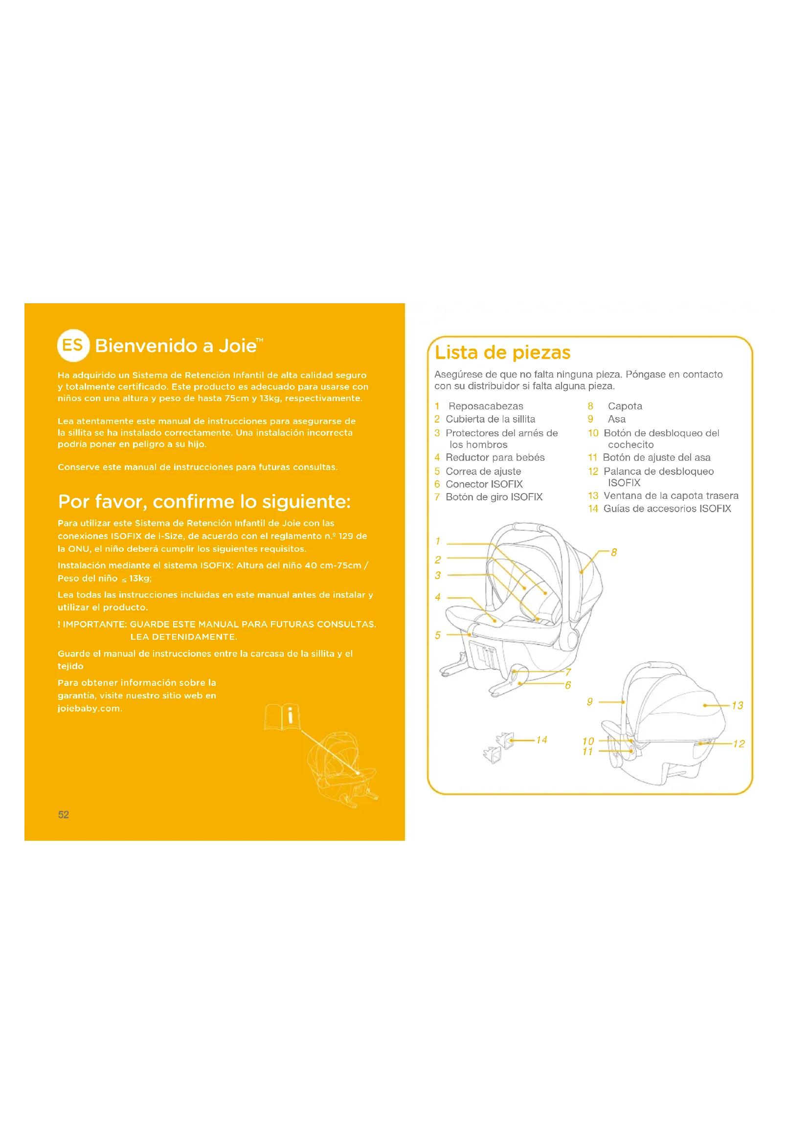 Ha adquirido un Sistema de Retención Infantil de alta calidad seguro y totalmente certificado. Este producto es adecuado para usarse con niños con una altura y peso de hasta 75cm y 13kg﹐ respectivamente.Lea atentamente este manual de instrucciones para asegurarse de la sillita se ha instalado correctamente. Una instalación incorrecta podría poner en peligro a su hijo.Conserve este manual de instrucciones para futuras consultas. Por favor﹐ confirme lo siguiente: Para utilizar este Sistema de Retención Infantil de Joie con las conexiones ISOFIX de i-Size﹐ de acuerdo con el reglamento n.º 129 de la ONU﹐ el niño deberá cumplir los siguientes requisitos.Instalación mediante el sistema ISOFIX: Altura del niño 40 cm-75cm / Peso del niño 13kg;Lea todas las instrucciones incluidas en este manual antes de instalar y utilizar el producto.! IMPORTANTE: GUARDE ESTE MANUAL PARA FUTURAS CONSULTAS.LEA DETENIDAMENTE.Guarde el manual de instrucciones entre la carcasa de la sillita y el tejidoPara obtener información sobre la garantía﹐ visite nuestro sitio web en joiebaby.com. Lista de piezas 1 Reposacabezas2 Cubierta de la sillita3 Protectores del arnés de los hombros4 Reductor para bebés5 Correa de ajuste6 Conector ISOFIX7 Botón de giro ISOFIX8 Capota9 Asa10 Botón de desbloqueo del cochecito11 Botón de ajuste del asa12 Palanca de desbloqueo ISOFIX13 Ventana de la capota trasera14 Guías de accesorios ISOFIXAsegúrese de que no falta ninguna pieza. Póngase en contacto con su distribuidor si falta alguna pieza.