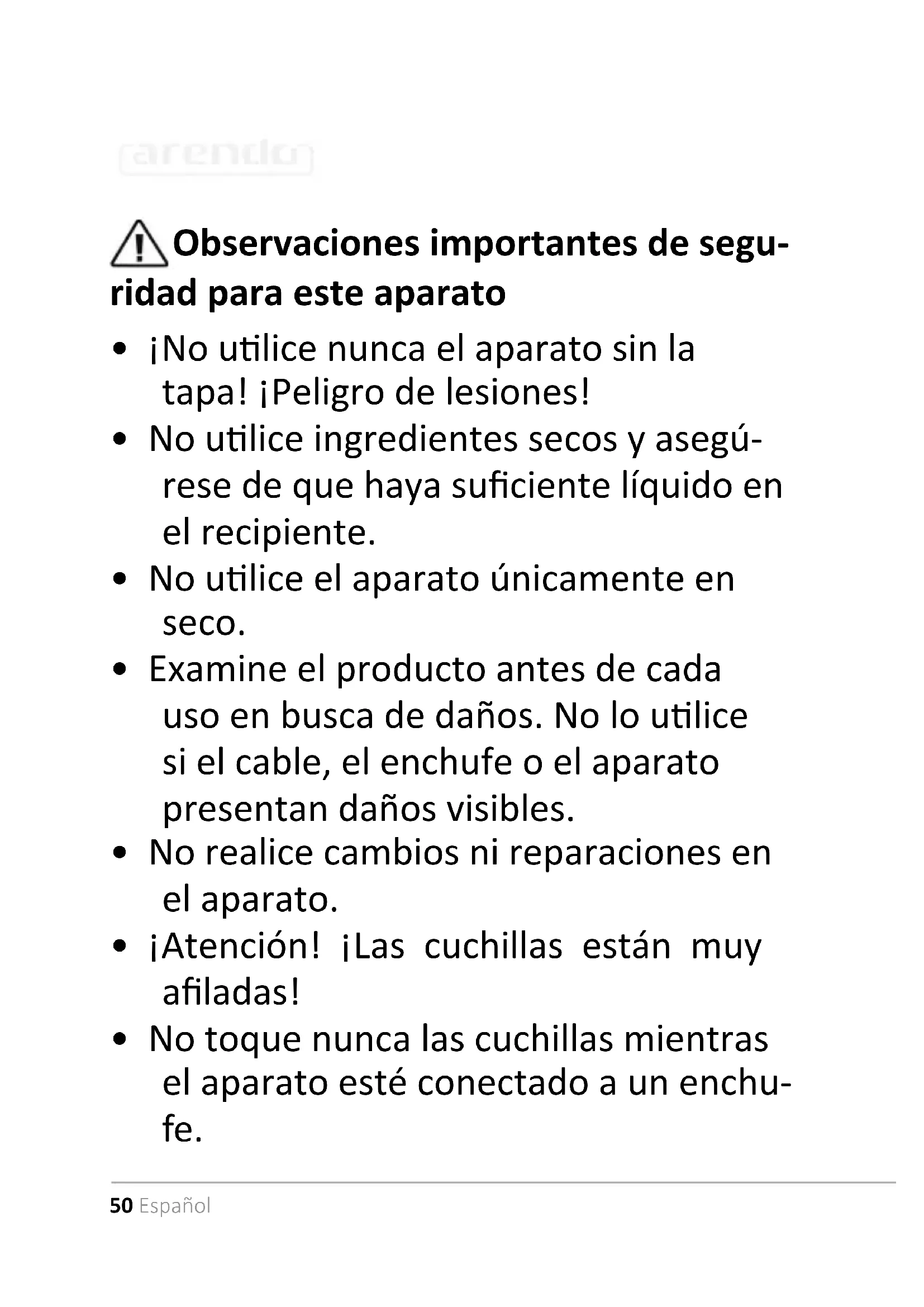 - Este equipo puede ser ulizado por personas con capacidades sicas, sensoriales o mentales reducidas, o con falta de experiencia y/o conoci- mientos, si han recibido supervisión o instrucción sobre el uso del equipo de forma segura y comprenden los peli- gros que conlleva.56 Español Gracias por escoger un producto de Arendo. Para que pueda disfrutar durante mucho empo de su adquisición, le rogamos que lea atentamente las siguientes instrucciones de uso. Antes de ponerlo en marcha, compruebe que el aparato suministrado no ene defectos ni daños, y que no le faltan piezas.
