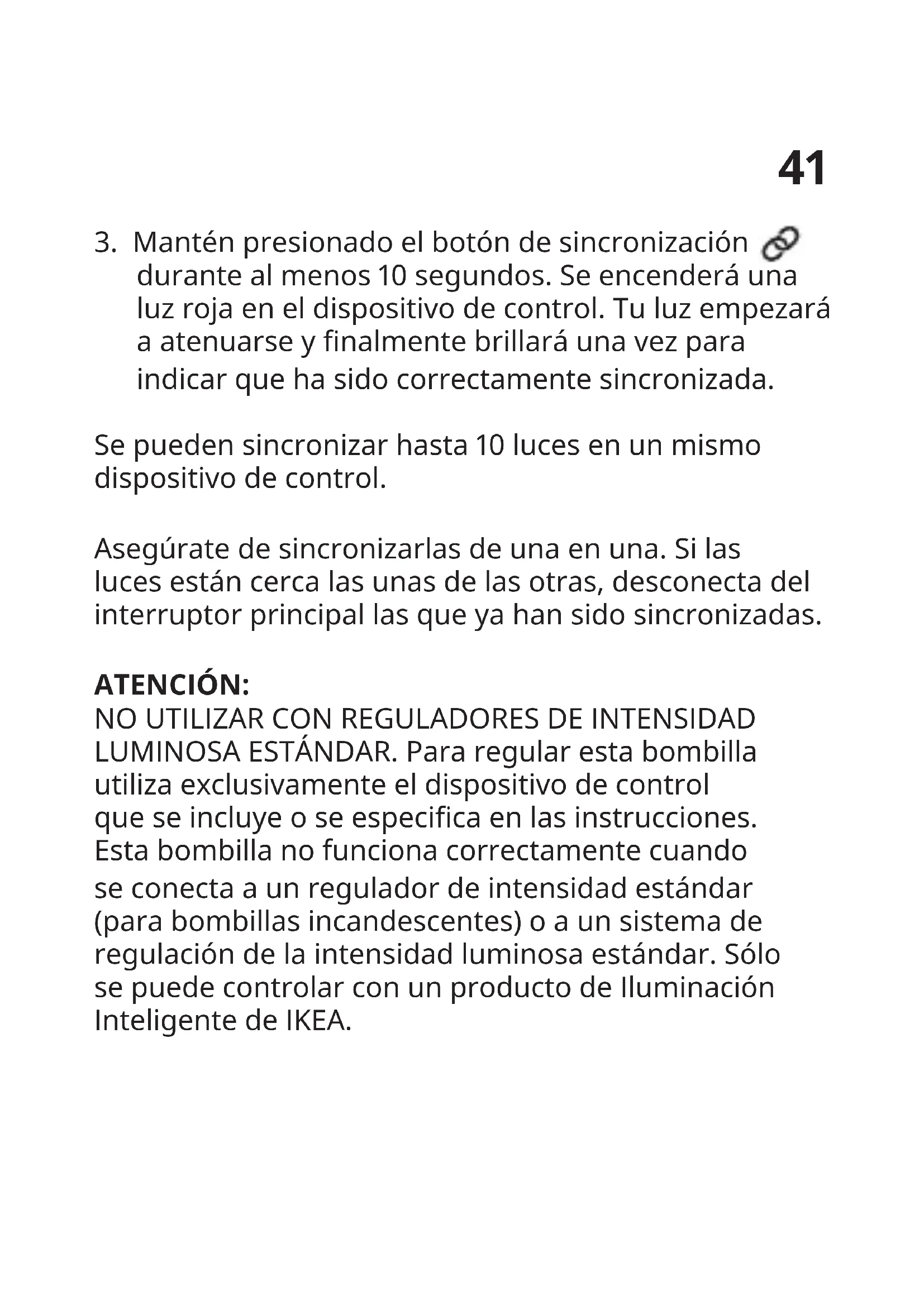 durante al menos 10 segundos. Se encenderá una luz roja en el dispositivo de control. Tu luz empezará a atenuarse y nalmente brillará una vez para indicar que ha sido correctamente sincronizada. Se pueden sincronizar hasta 10 luces en un mismo dispositivo de control. Asegúrate de sincronizarlas de una en una. Si las luces están cerca las unas de las otras, desconecta del interruptor principal las que ya han sido sincronizadas. ATENCIÓN: