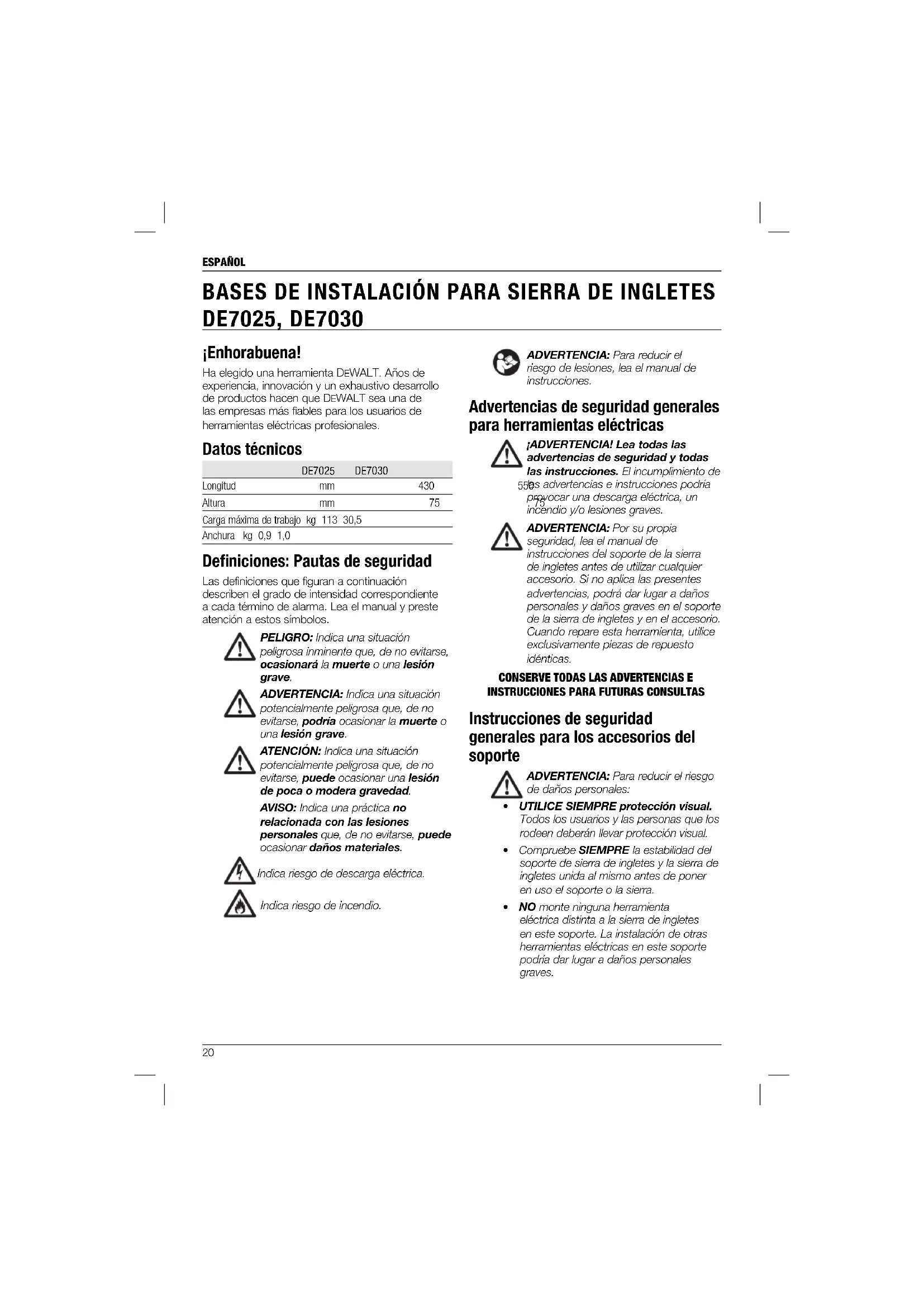 BASES DE INSTALACIÓN PARA SIERRA DE INGLETES DE7025, DE7030 ¡Enhorabuena! Ha elegido una herramienta DEWALT. Años de experiencia, innovación y un exhaustivo desarrollo de productos hacen que DEWALT sea una de las empresas más fiables para los usuarios de herramientas eléctricas profesionales. Datos técnicos DE7025 DE7030 Longitud mm 430 550 Altura mm 75 75 Carga máxima de trabajo kg 113 30,5 Anchura kg 0,9 1,0 Defi niciones: Pautas de seguridad Las definiciones que figuran a continuación describen el grado de intensidad correspondiente a cada término de alarma. Lea el manual y preste atención a estos símbolos. PELIGRO: Indica una situación peligrosa inminente que, de no evitarse, ocasionará la muerte o una lesión grave. ADVERTENCIA: Indica una situación potencialmente peligrosa que, de no evitarse, podría ocasionar la muerte o una lesión grave. ATENCIÓN: Indica una situación potencialmente peligrosa que, de no evitarse, puede ocasionar una lesión de poca o modera gravedad. AVISO: Indica una práctica no relacionada con las lesiones personales que, de no evitarse, puede ocasionar daños materiales. Indica riesgo de descarga eléctrica. Indica riesgo de incendio. ADVERTENCIA: Para reducir el riesgo de lesiones, lea el manual de instrucciones. Advertencias de seguridad generales para herramientas eléctricas ¡ADVERTENCIA! Lea todas las advertencias de seguridad y todas las instrucciones. El incumplimiento de las advertencias e instrucciones podría provocar una descarga eléctrica, un incendio y/o lesiones graves. ADVERTENCIA: Por su propia seguridad, lea el manual de instrucciones del soporte de la sierra de ingletes antes de utilizar cualquier accesorio. Si no aplica las presentes advertencias, podrá dar lugar a daños personales y daños graves en el soporte de la sierra de ingletes y en el accesorio. Cuando repare esta herramienta, utilice exclusivamente piezas de repuesto idénticas.