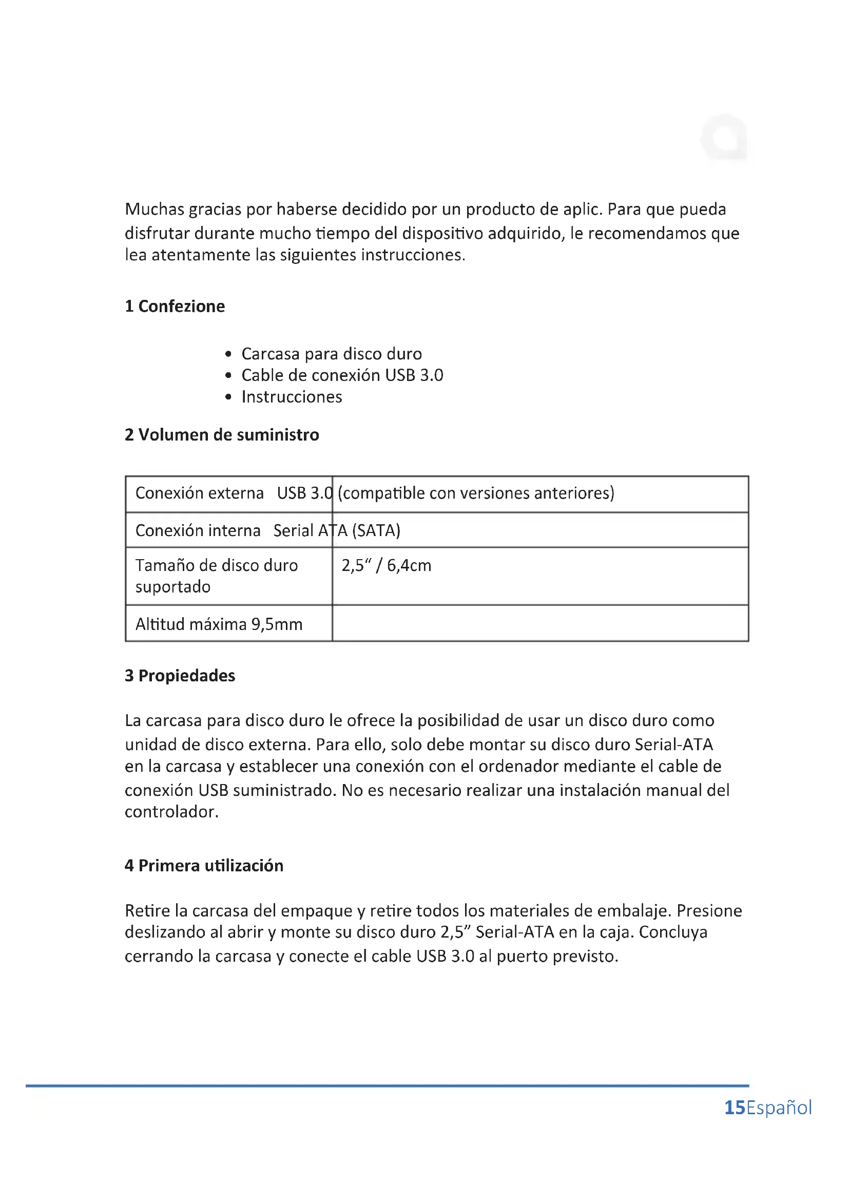 - Instrucciones 2 Volumen de suministro Conexión externa USB 3.0 (compable con versiones anteriores) Conexión interna Serial ATA (SATA) Tamaño de disco duro suportado 2,5“ / 6,4cm Altud máxima 9,5mm 3 Propiedades La carcasa para disco duro le ofrece la posibilidad de usar un disco duro como unidad de disco externa. Para ello, solo debe montar su disco duro Serial-ATA en la carcasa y establecer una conexión con el ordenador mediante el cable de conexión USB suministrado. No es necesario realizar una instalación manual del controlador. 4 Primera ulización Rere la carcasa del empaque y rere todos los materiales de embalaje. Presione deslizando al abrir y monte su disco duro 2,5” Serial-ATA en la caja. Concluya cerrando la carcasa y conecte el cable USB 3.0 al puerto previsto.16 Español 5 Instrucciones de seguridad y exención de responsabilidad No intente nunca abrir el aparato para repararlo o modicarlo. Evite entrar en contacto con las tensiones de la red. No cortocircuite el producto. El disposivo no es impermeable, manténgalo siempre seco. Protéjalo de una elevada humedad ambiental, agua y nieve. No exponga el disposivo a altas temperaturas. No someta el disposivo a repennos cambios térmicos o fuertes vibraciones, ya que las piezas electrónicas podrían resultar dañadas. Compruebe el disposivo antes de ulizarlo por si presentara algún deterioro. No ulice el disposivo si ha recibido un golpe o se ha dañado de cualquier otro modo. Respete las disposiciones y restricciones nacionales. No ulice el disposivo para otros nes a los detallados en el manual. Este producto no es un juguete. Manténgalo alejado de los niños o las personas con discapaci- dad mental. Toda reparación o modicación en el disposivo que no haya sido efectuada por el proveedor original ocasiona la pérdida de todos los derechos de garana. El disposivo solo puede ser ulizado por personas que hayan leído y comprendido este manual. Las especicaciones del producto pueden cambiar sin un aviso previo. 6 Indicaciones para la eliminación Según la direcva europea WEEE, está prohibido eliminar los equipos eléctricos y electrónicos con la basura domésca. Sus componentes se deben llevar por separado a los puntos de reciclaje o eliminación correspondientes, ya que compo- nentes venenosos y peligrosos pueden dañar el medio ambiente a largo plazo si no se eliminan correctamente. Como consumidor, la ley sobre residuos eléctricos y electrónicos alemana (Elek- troG) le obliga a devolver gratuitamente los disposivos eléctricos y electrónicos al nal de su vida úl al fabricante, el punto de venta o al punto público de reco- gida establecido para ello. El derecho regional regula parcularidades al respecto. El símbolo en el producto, el manual de uso y/o el embalaje advierte de estas disposiciones. Esta forma de separación, reulización y eliminación de materiales le permite contribuir en gran medida a proteger nuestro entorno.17Español Direcva WEEE: 2012/19/EU N.º reg. WEEE: DE 94495668 Por la presente, la empresa WD Plus GmbH declara que el disposivo 302509/20170209SZ135 cumple los requisitos fundamentales y las demás dis- posiciones especícas. Puede obtener una declaración de conformidad íntegra en: WD Plus GmbH, Wohlenbergstraße 16, 30179 Hannover18 Notes19 NotesWD Plus GmbH Wohlenbergstraße 16 · 30179 Hannover Germany