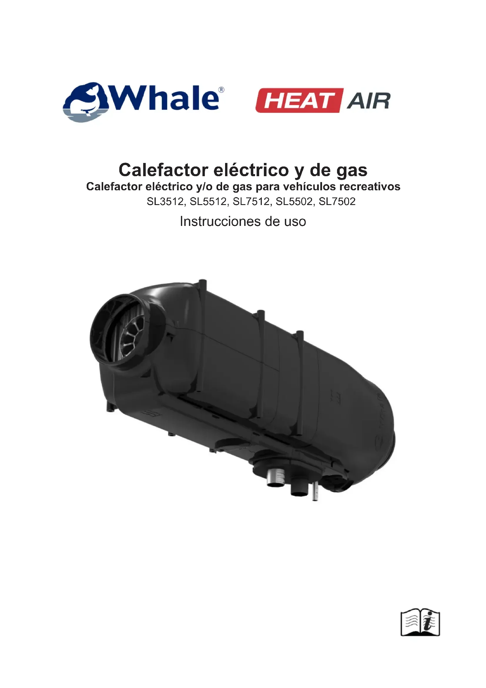 es una marca comercial registrada de Munster Simms Engineering Limited, Bangor, Irlanda del Norte, que realiza sus actividades comerciales bajo el nombre de Whale. Whale sigue una política de mejora continua, por lo que nos reservamos el derecho de modicar las especicaciones sin aviso previo. Las ilustraciones cumplen una nalidad meramente orientativa. La empresa no garantiza la exactitud ni la exhaustividad de la información contenida en ningún folleto de este o de cualquier otro producto y podrá modicarla a su sola discreción.Heteluchtverwarming voor recreatievoertuigen werkend op gas en/of elektrisch Gas- en elektrische ruimteverwarmer SL3512, S;5512, SL7512, SL5502, SL7502 BedieningsinstructiesHet Heat Air Pack bevat: Inhoud: Paginanr.: 1 x gas- en elektrische ruimteverwarmer