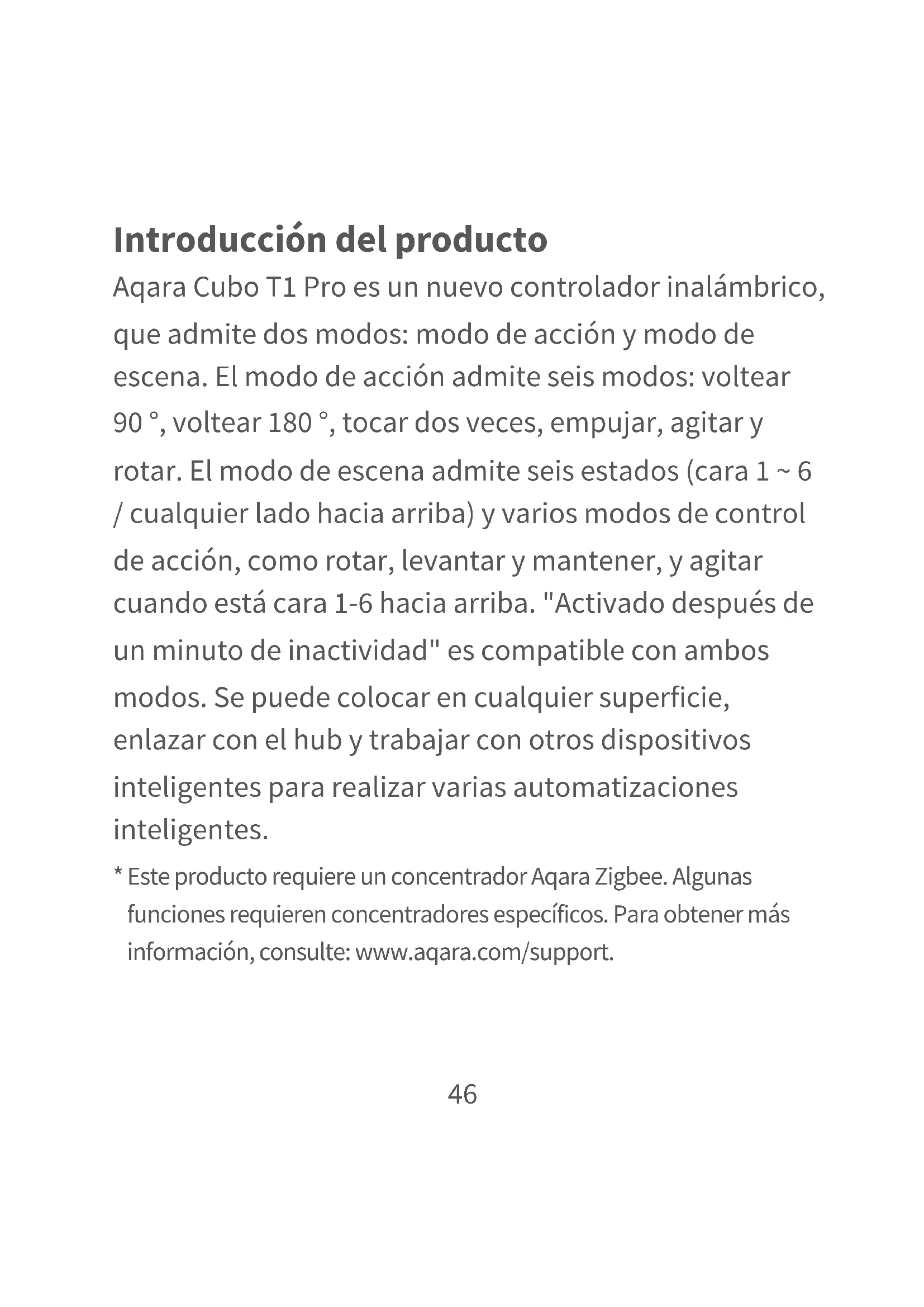 faible pouvant provoquer une explosion ou la fuite de liquide ou de gaz inflammables.* Este producto requiere un concentrador Aqara Zigbee. Algunas funciones requieren concentradores específicos. Para obtener más información, consulte: www.aqara.com/support. Aqara Cubo T1 Pro es un nuevo controlador inalámbrico, que admite dos modos: modo de acción y modo de escena. El modo de acción admite seis modos: voltear ЫТٺя1*'/ -УЪТٺя/*-*.1 .я (+0%-я"$/-4 rotar. El modo de escena admite seis estados (cara 1 ~ 6 / cualquier lado hacia arriba) y varios modos de control de acción, como rotar, levantar y mantener, y agitar cuando está cara 1-6 hacia arriba. "Activado después de un minuto de inactividad" es compatible con ambos modos. Se puede colocar en cualquier superficie, enlazar con el hub y trabajar con otros dispositivos inteligentes para realizar varias automatizaciones inteligentes. Introducción del producto