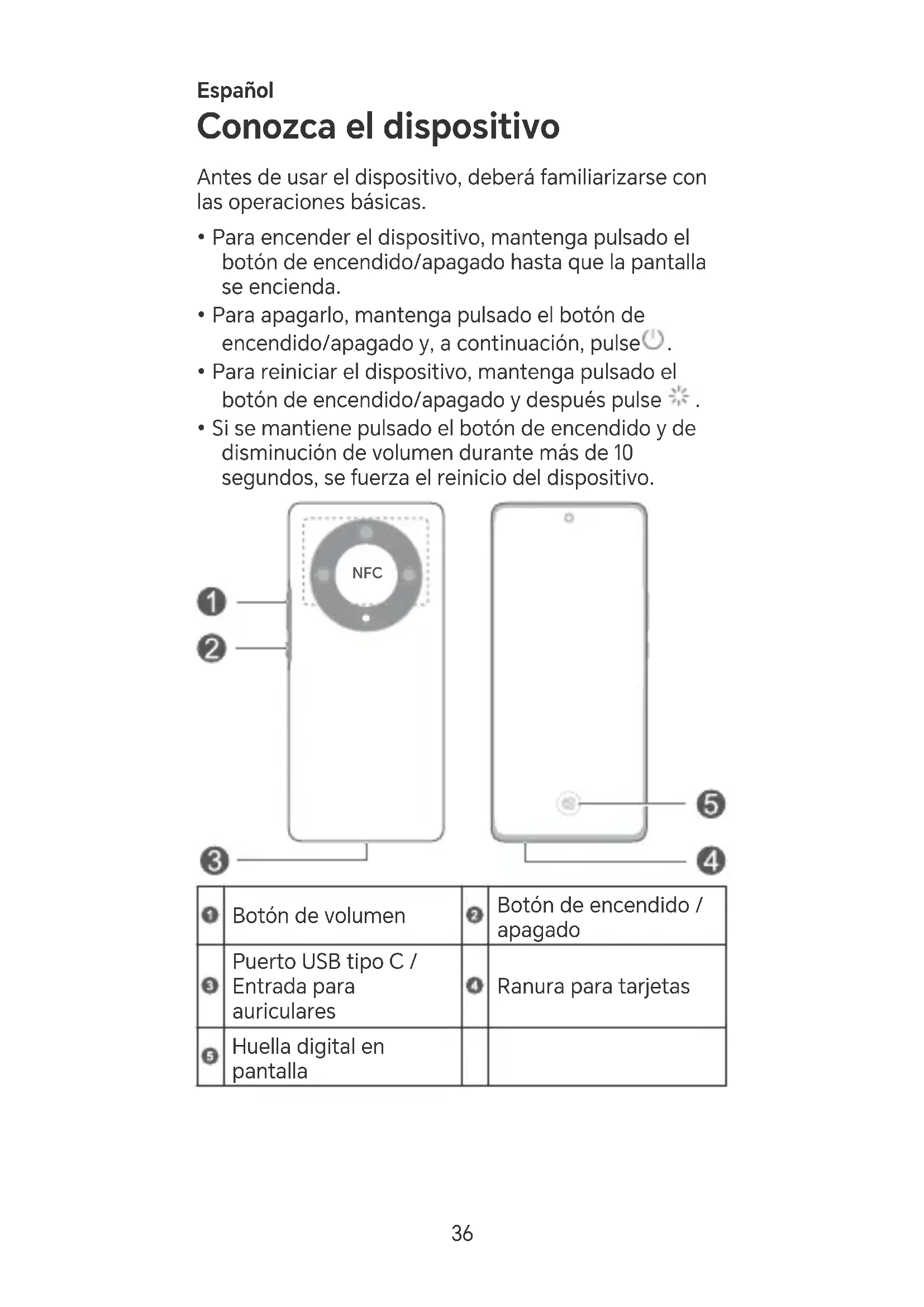 - Si se mantiene pulsado el botón de encendido y de disminución de volumen durante más de 10 segundos, se fuerza el reinicio del dispositivo.