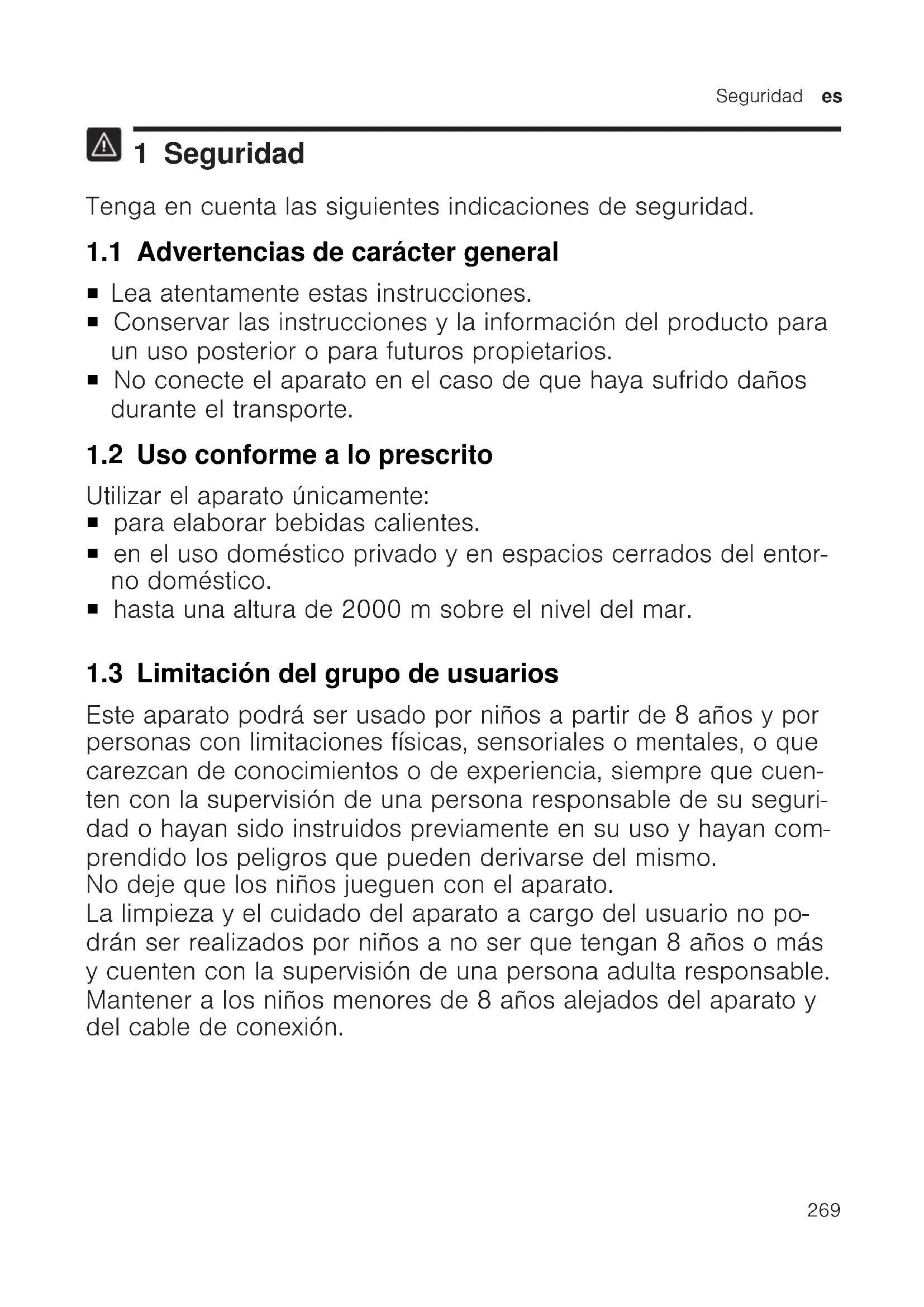 Lea atentamente estas instrucciones. ¡ Conservar las instrucciones y la información del producto para un uso posterior o para futuros propietarios. ¡ No conecte el aparato en el caso de que haya sufrido daños durante el transporte. 1.2 Uso conforme a lo prescrito Utilizar el aparato únicamente: ¡ para elaborar bebidas calientes. ¡ en el uso doméstico privado y en espacios cerrados del entor- no doméstico. ¡ hasta una altura de 2000msobre el nivel del mar. 1.3 Limitación del grupo de usuarios Este aparato podrá ser usado por niños a partir de 8 años y por personas con limitaciones físicas, sensoriales o mentales, o que carezcan de conocimientos o de experiencia, siempre que cuen- ten con la supervisión de una persona responsable de su seguri- dad o hayan sido instruidos previamente en su uso y hayan com- prendido los peligros que pueden derivarse del mismo. No deje que los niños jueguen con el aparato. La limpieza y el cuidado del aparato a cargo del usuario no po- drán ser realizados por niños a no ser que tengan 8 años o más y cuenten con la supervisión de una persona adulta responsable. Mantener a los niños menores de 8 años alejados del aparato y del cable de conexión.es Seguridad